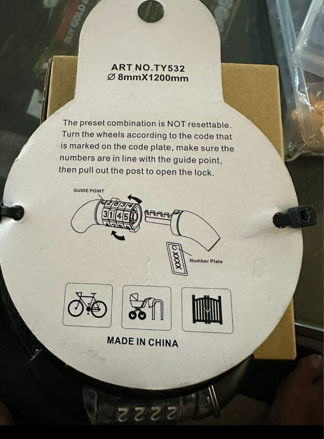 This is a 8mm x 1200mm security cable lock. The preset combination is not resettable. It's designed for securing bicycles, strollers, or gates. Made in China.