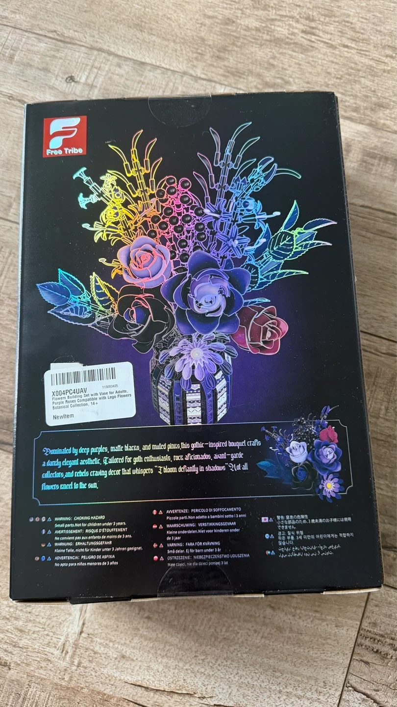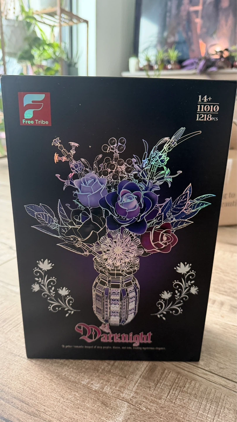 Brand new, unopened Darknight. This building block set features a gothic-romantic bouquet of deep purples, blacks, and reds. It's inspired by roses and designed with intricate details. The set includes 1218 pieces.