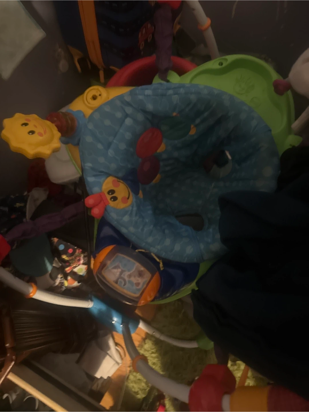 This baby jumper features a seat with a blue polka dot pattern and several colourful toys attached. It's designed for infant entertainment and development.