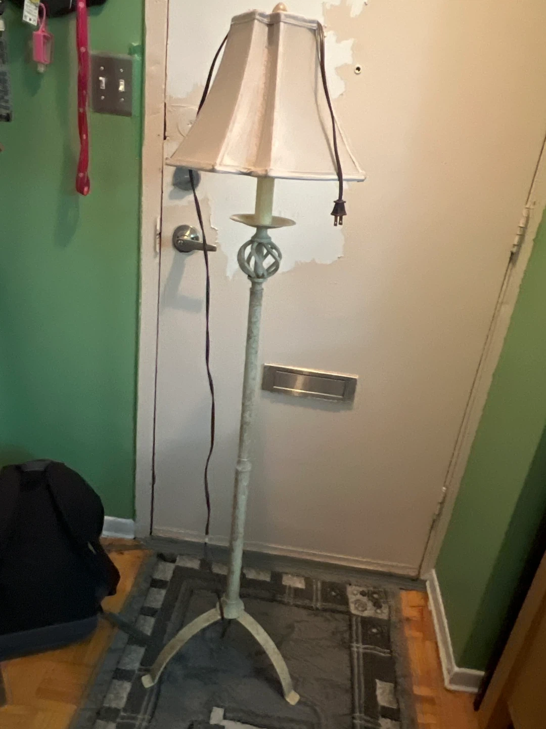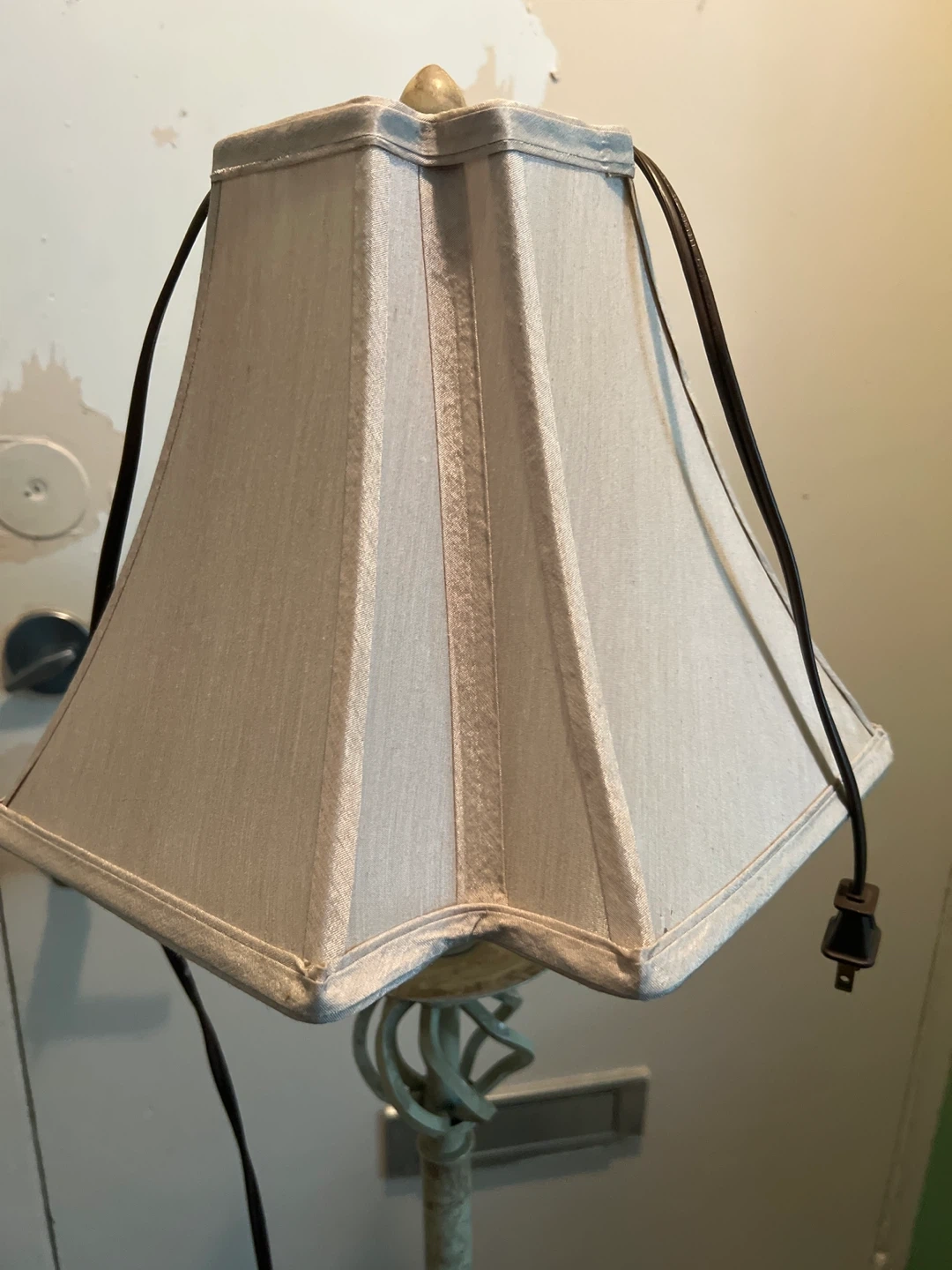 This floor lamp features a classic design with a cream-coloured fabric shade and a decorative metal stem. It has a sturdy tripod base for stability. Adds a touch of vintage charm to any room.