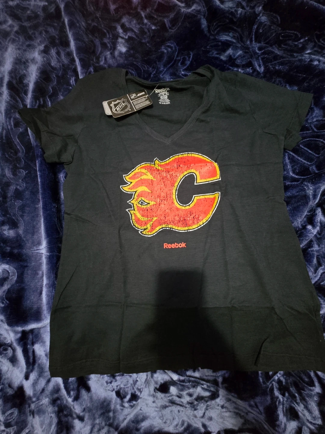 Black women's t-shirt featuring the Calgary Flames logo. It's a Reebok branded NHL apparel item. Made with a comfortable fabric blend.
