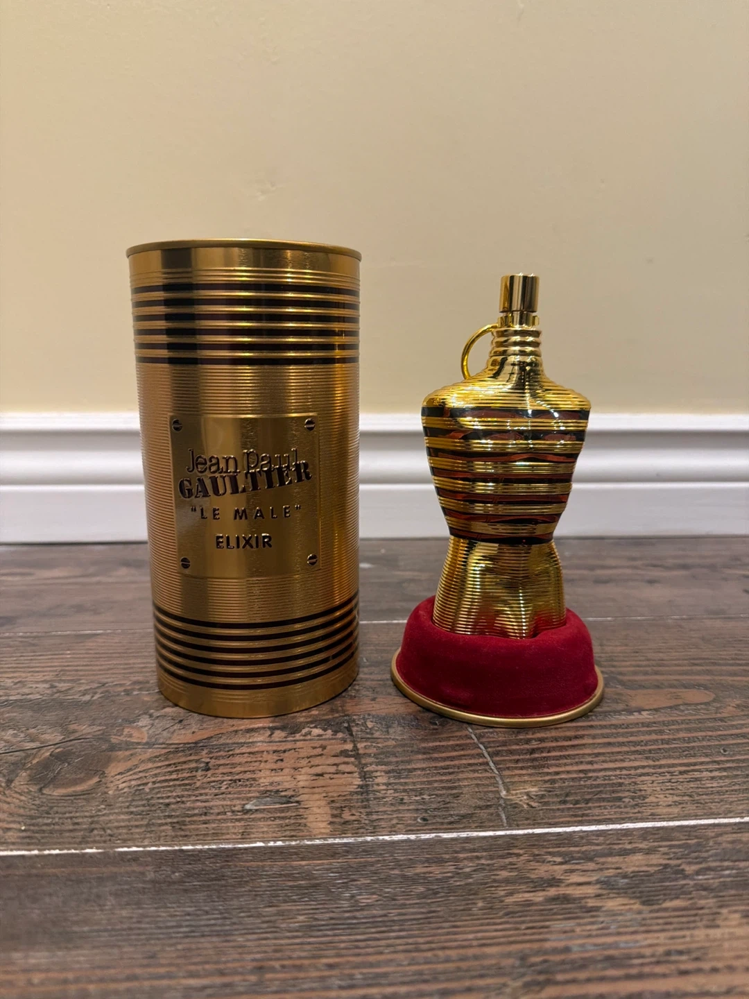 Jean Paul Gaultier "Le Male" Elixir Eau de Parfum in a striking gold bottle. It comes with its original cylindrical presentation case. This fragrance offers a rich and captivating scent experience.