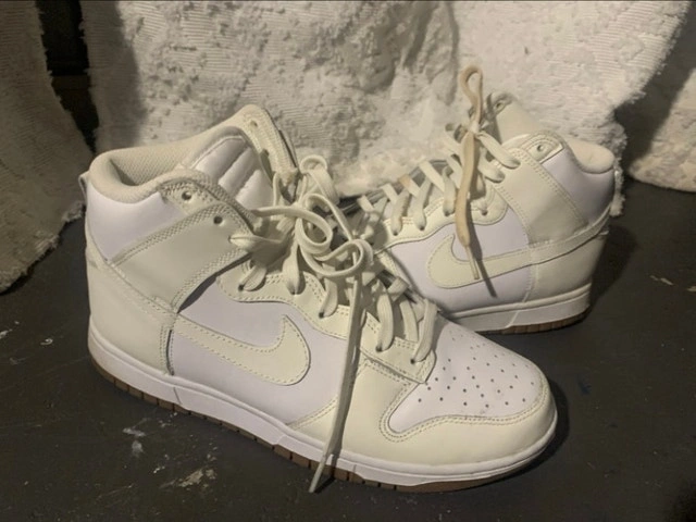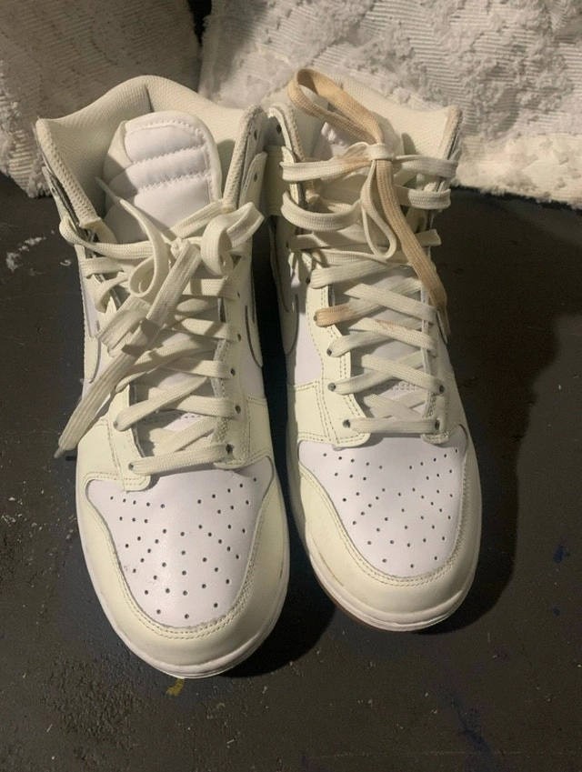 Get ready to elevate your sneaker game with these Nike Dunk Highs! These shoes feature a clean, all-white colourway and the iconic Nike swoosh, perfect for making a statement. Please note that these are in used condition, adding a bit of character to their classic design. Specifications: Brand: Nike, Model: Dunk High, Colour: White, Style: High-top, Condition: Used - Good. Size 8.5 Cash and cashless payments accepted. For sale by owner.