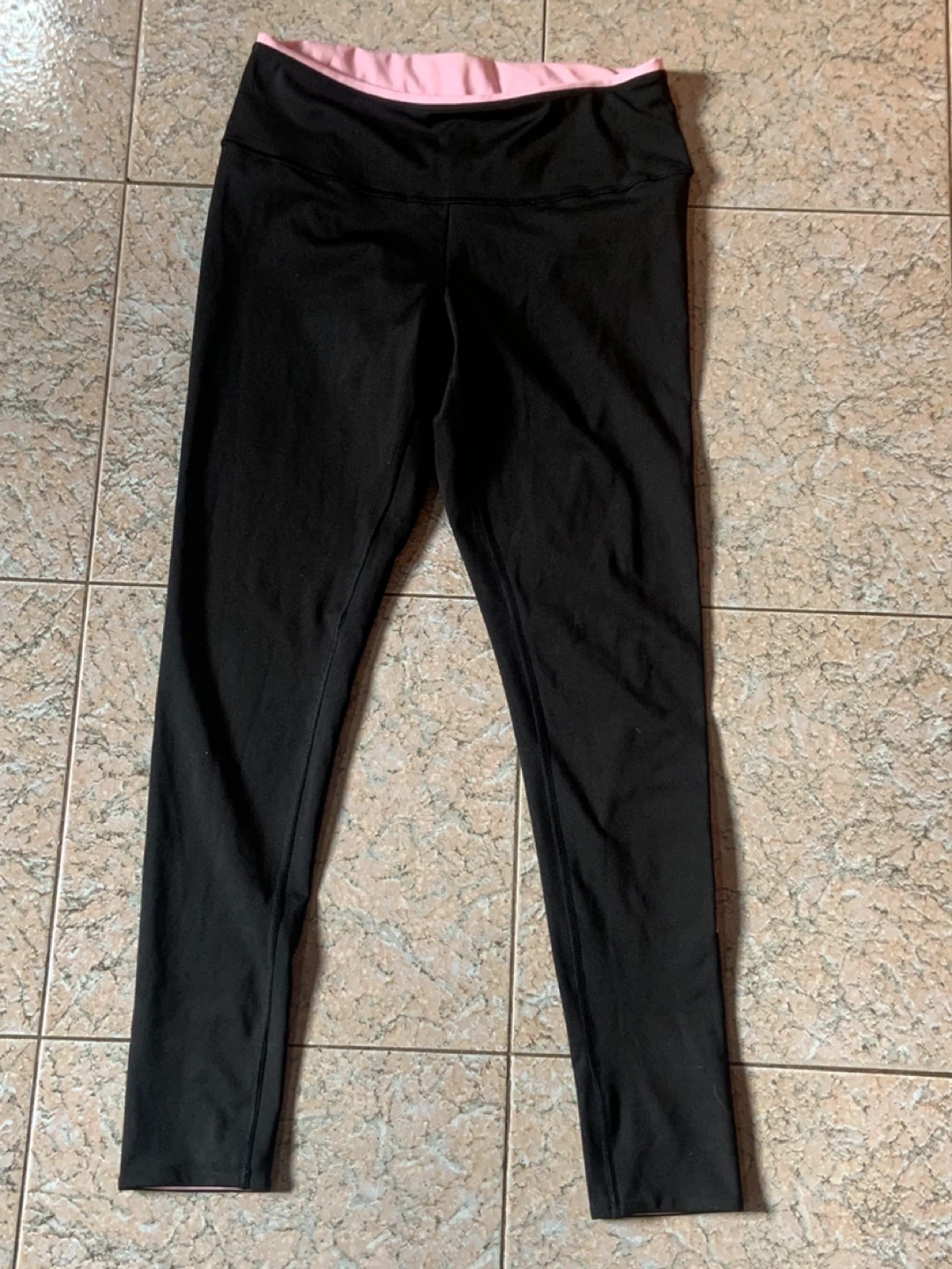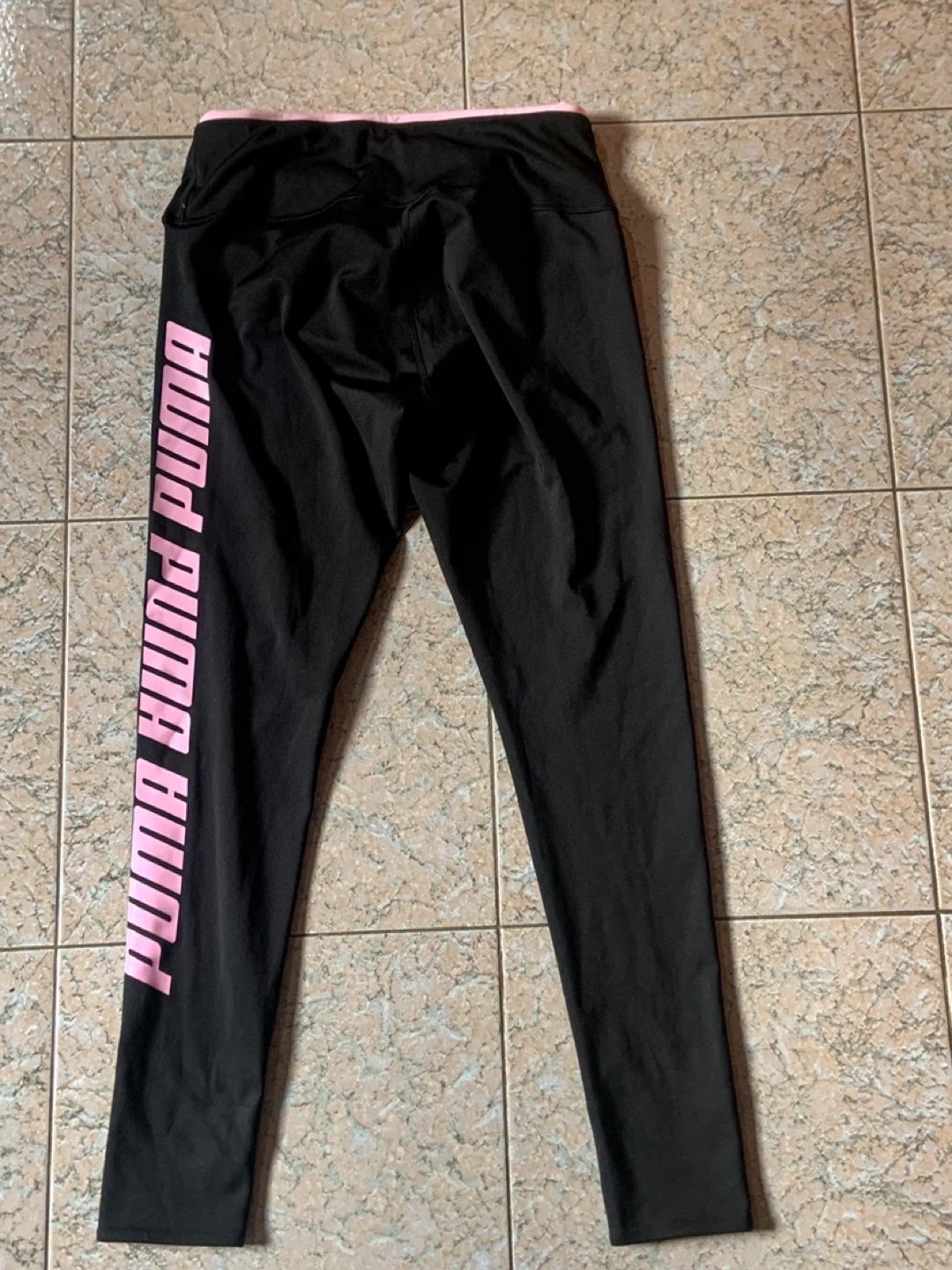 Puma black leggings with a pink waistband and "PUMA PUMA PUMA" logo down the side. Made from a comfortable, stretchy material. Perfect for workouts or casual wear!