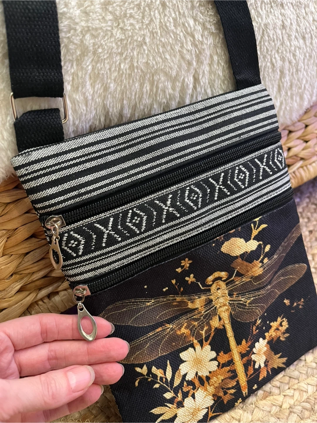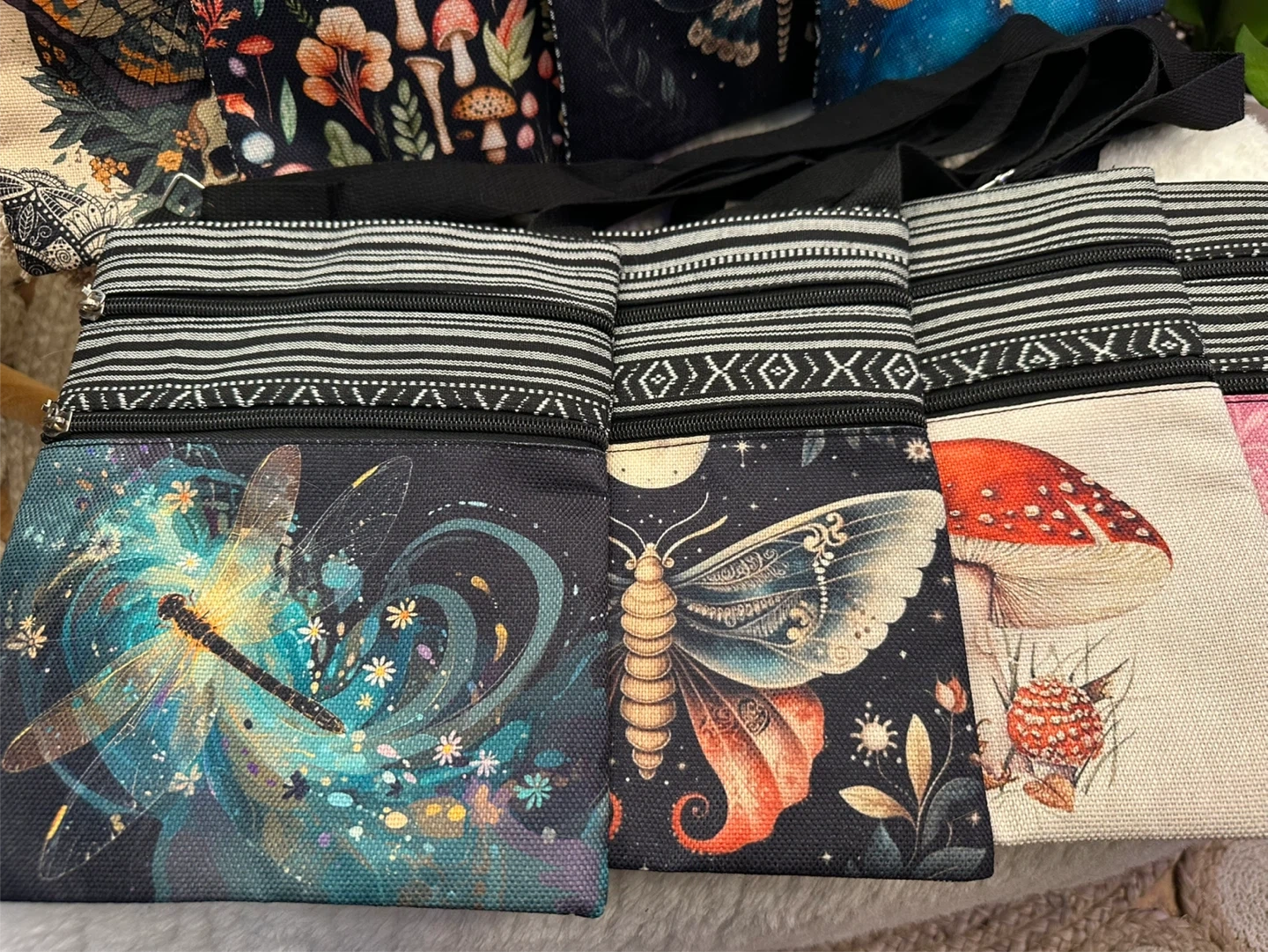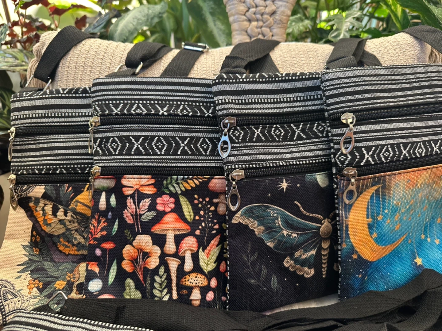 Cute collection of fabric crossbody handbags featuring unique, vibrant nature inspired graphic prints. Made with durable fabric and include double zipper closures for secure storage. Great for everyday use or travel!