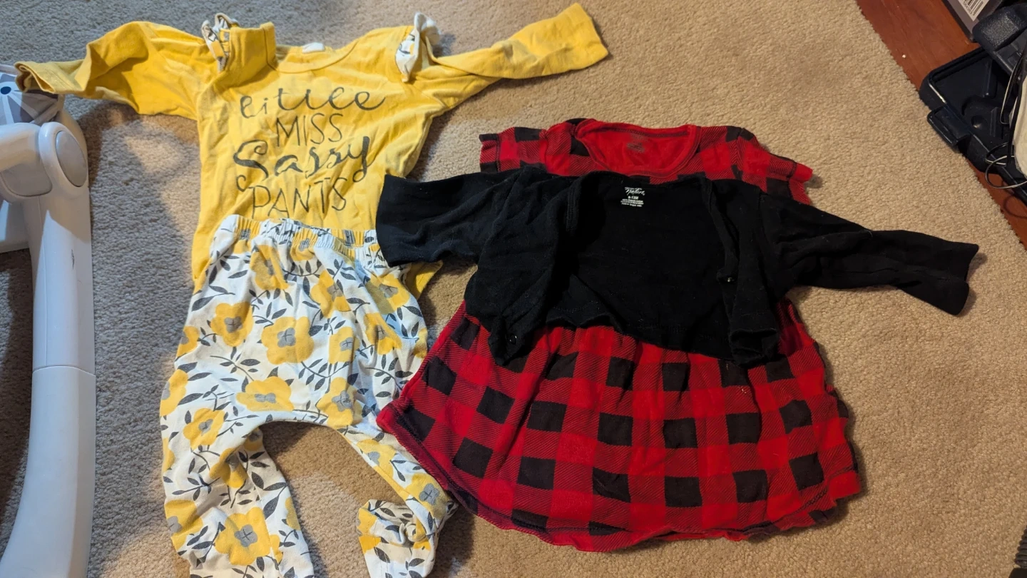 Cute yellow long-sleeve shirt with 'Little Miss Sassy Pants' graphic and floral pattern pants - size 12 months. Also includes a red and black buffalo plaid dress with a matching black cardigan - size 9-12 months. This set is perfect for keeping your little one stylish and comfy!