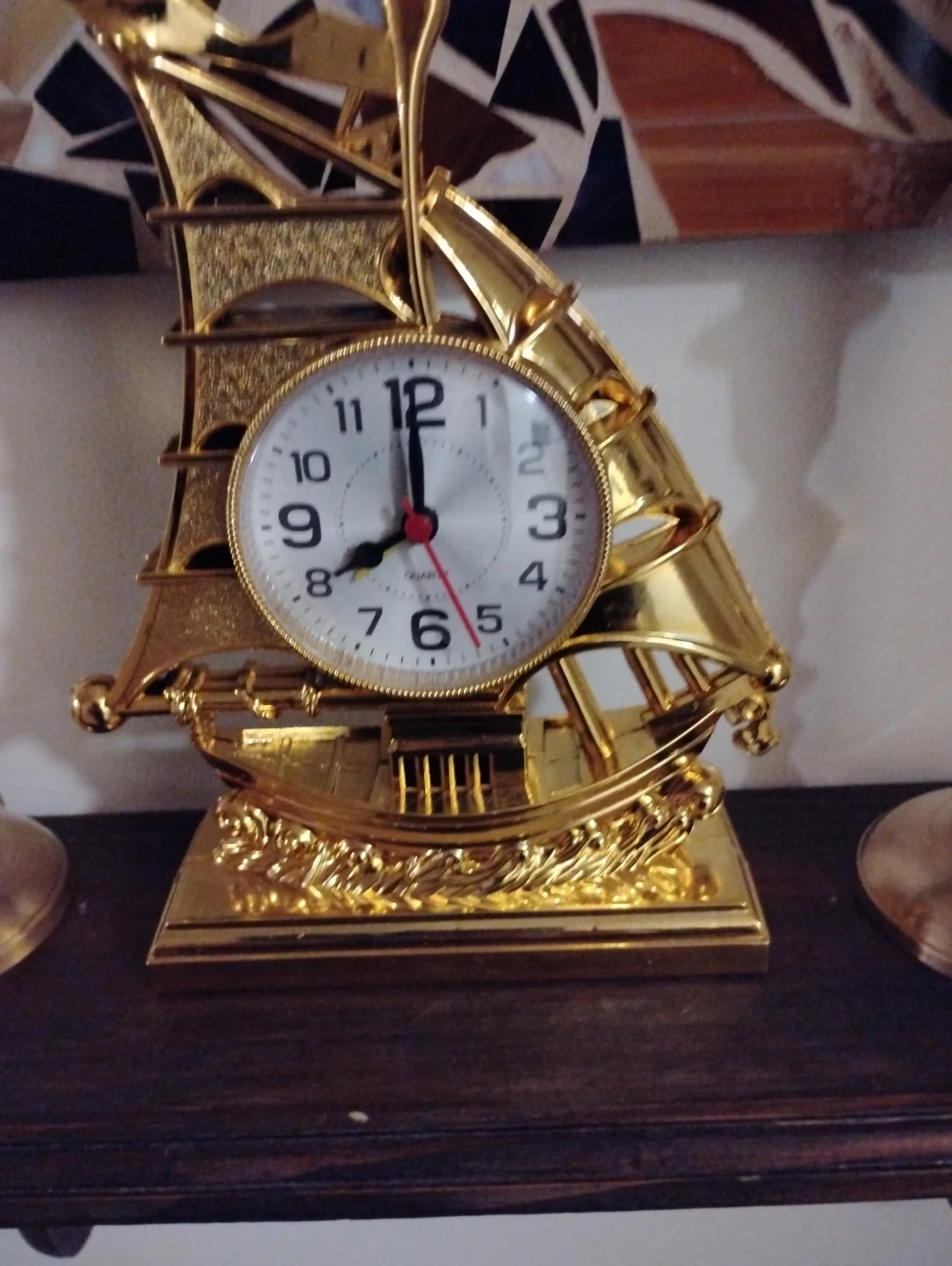 This decorative clock is designed in the shape of a gold sailboat. It features a classic white face with black numerals and hands. Plastic with a gold finish.