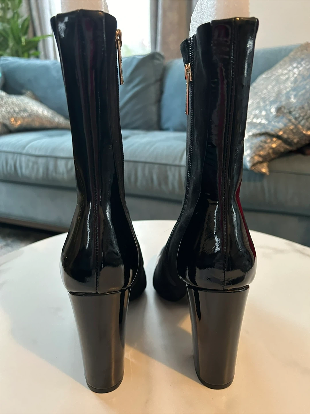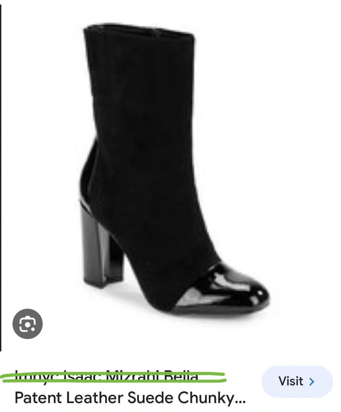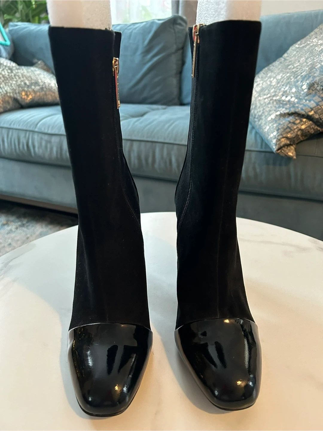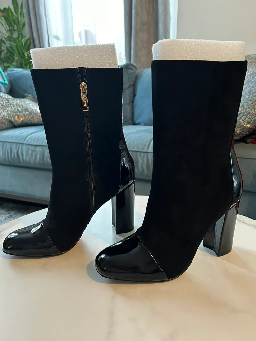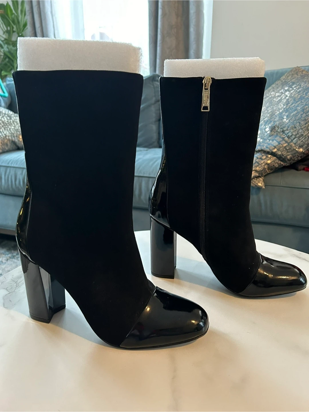 BRAND NEW! These Isaac Mizrahi 'Bella' boots are a stylish addition to any wardrobe! They feature a combination of black suede and patent leather, giving them a chic and modern look. The chunky heel adds a touch of elegance and provides comfortable support. They're perfect for dressing up or down!