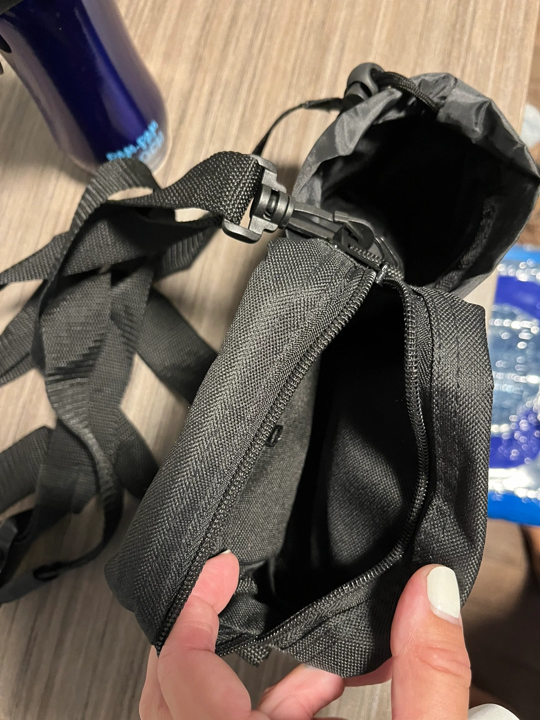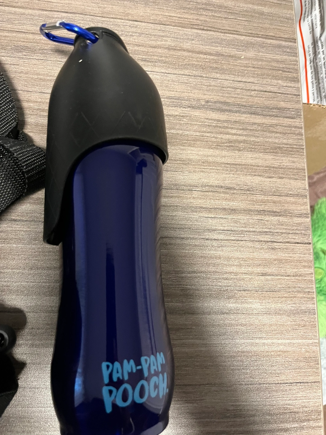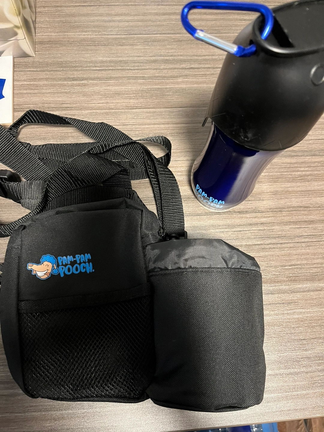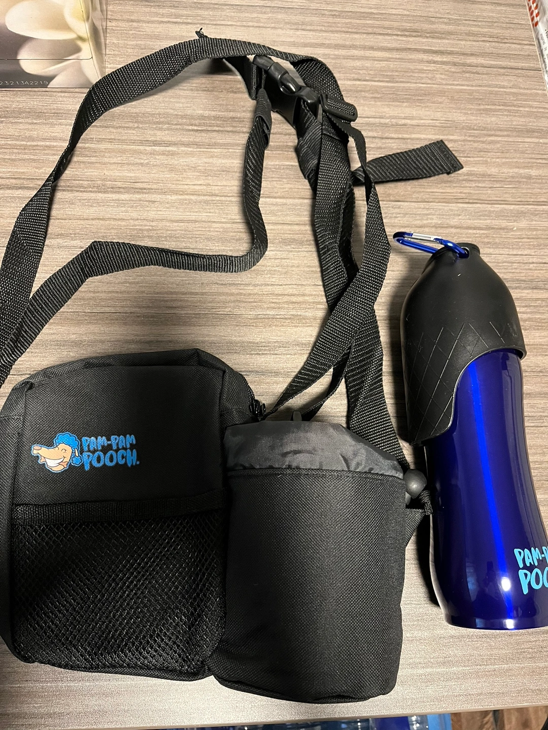 A Pam-Pam Pooch dog walking set that includes a water bottle, a pouch with an attachable strap, and a small pouch for treats or other items.
