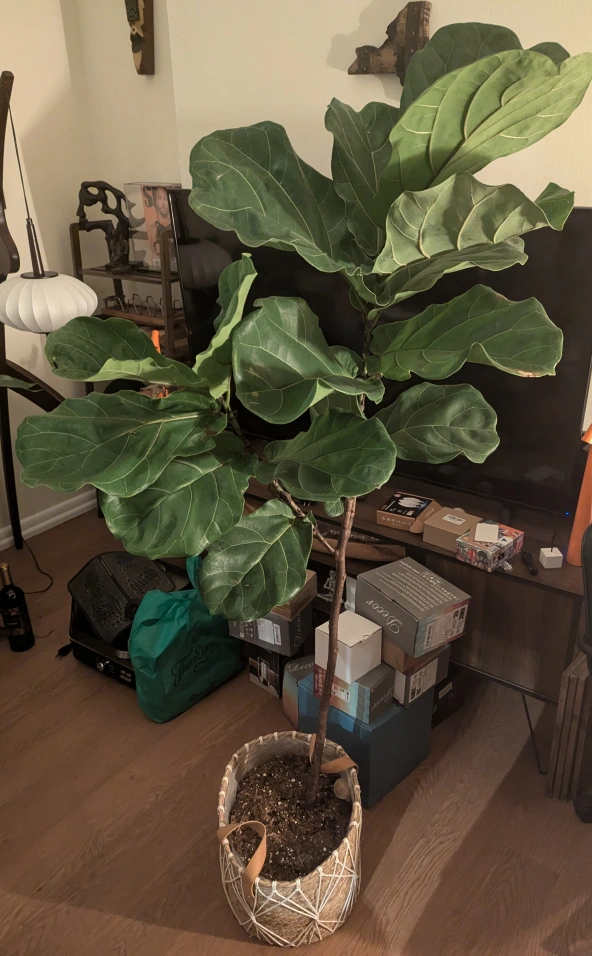 Large Fiddle Leaf Fig plant in a woven basket. The plant is healthy and well-maintained. The plant is currently in a decorative woven basket. Pick up only. Buyer is responsible for loading and transport.
