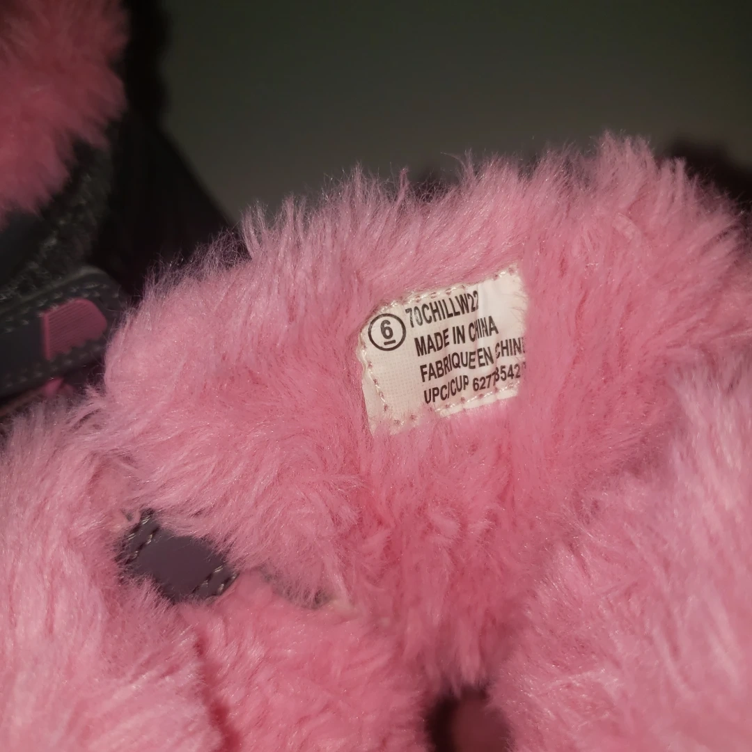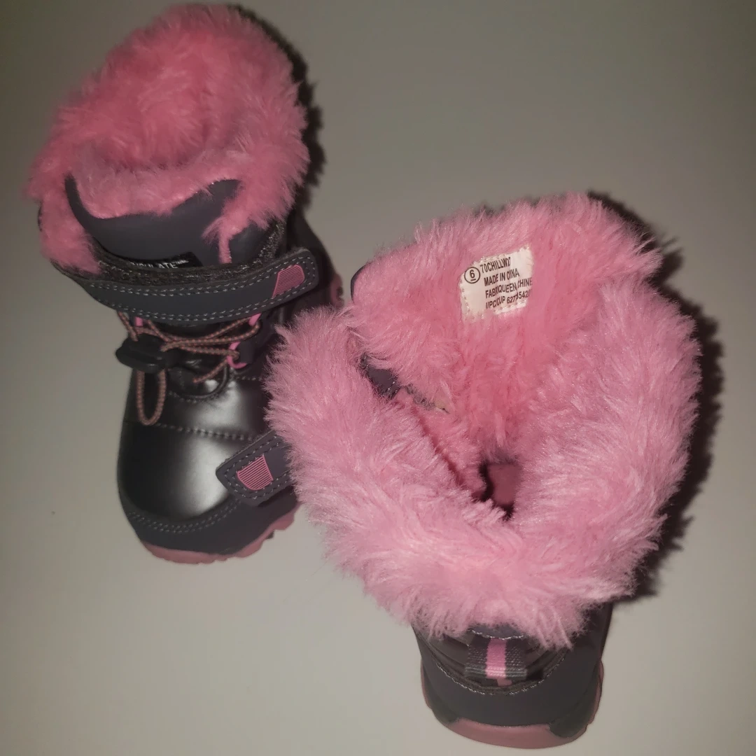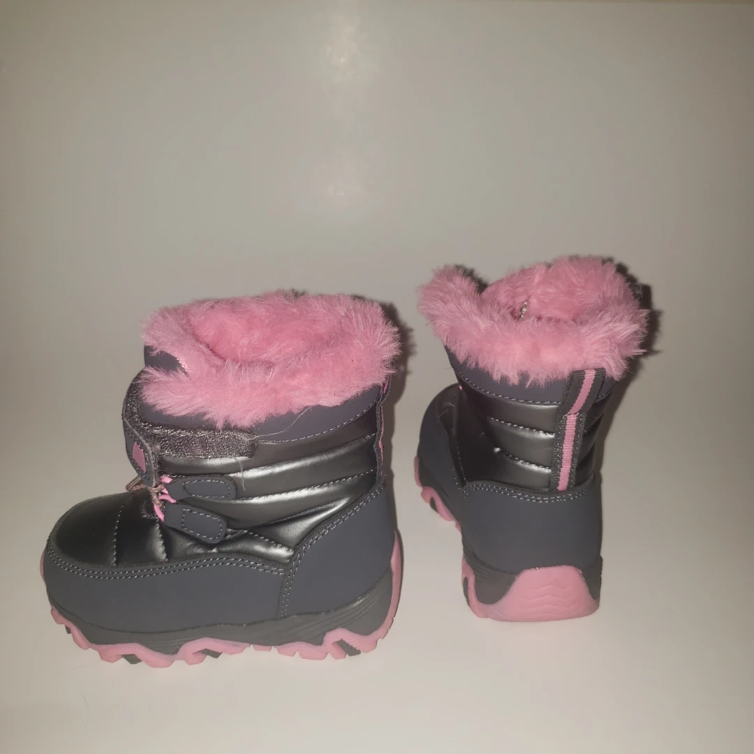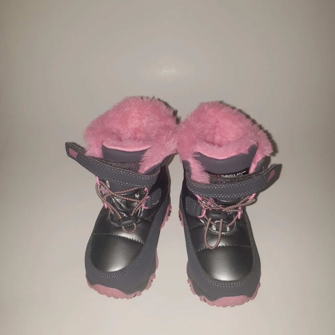109Grey and pink winter boots with pink faux fur lining. They have a velcro closure and a zipper.