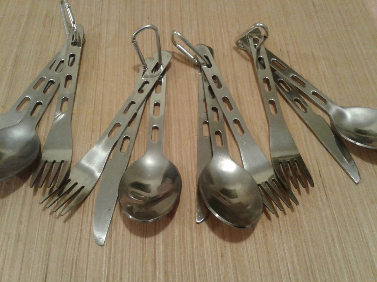 Set of cutlery including a fork, a knife, and two spoons. All pieces are connected with a carabiner for easy storage and carrying.