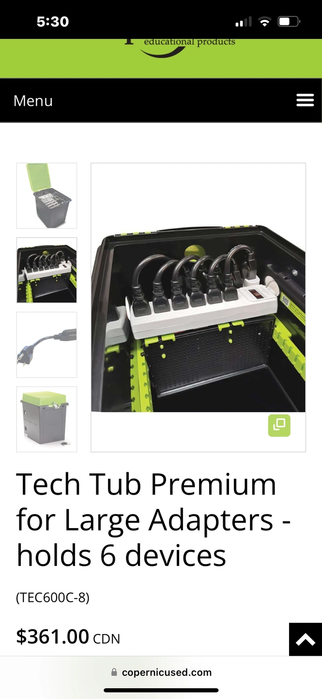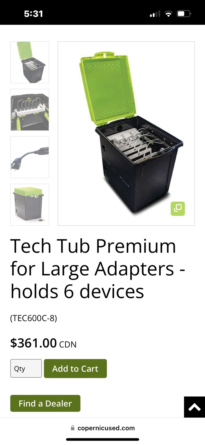 This Original Tech Tub® has the capability to charge up to 6 devices. It makes sharing small sets of devices easy within a classroom, workplace. Adjustable dividers can accommodate most cases and the side cable management channel helps keep cords neat, tidy and lined up with each device.
