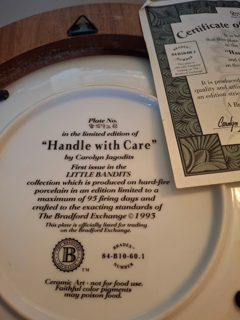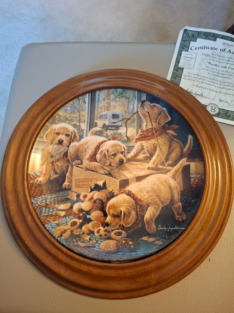 Decorative plate in frame, featuring 4 golden retriever puppies opening up a package. Plate is called "Handle with Care" - first issue in the Little Bandits series from Bradford Exchange. 11.5” across.