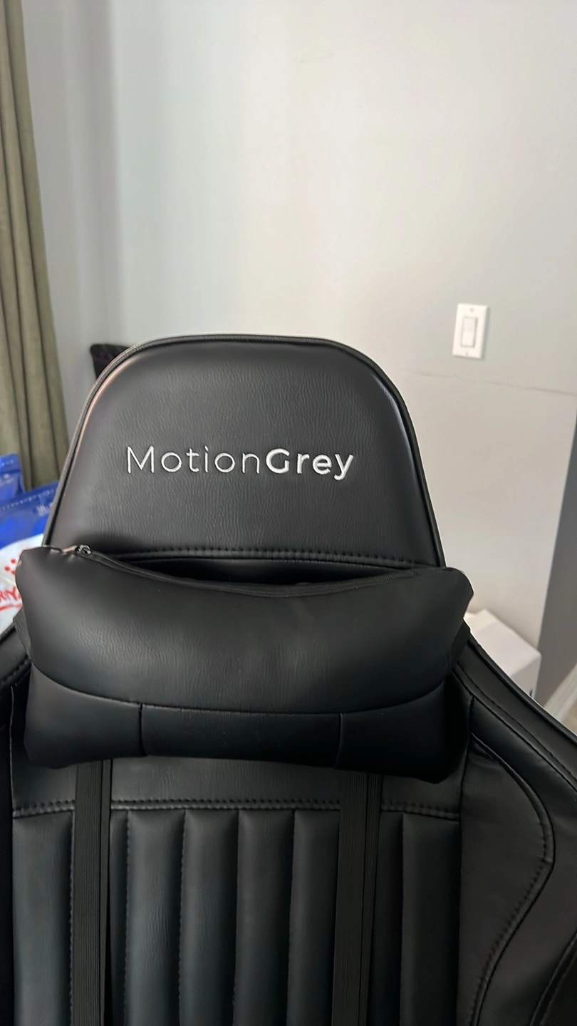 Black office/gaming chair with adjustable arm rests and headrest. The chair features a padded lumbar support and is made of PU leather. The base has a five-point star design with a black colour.