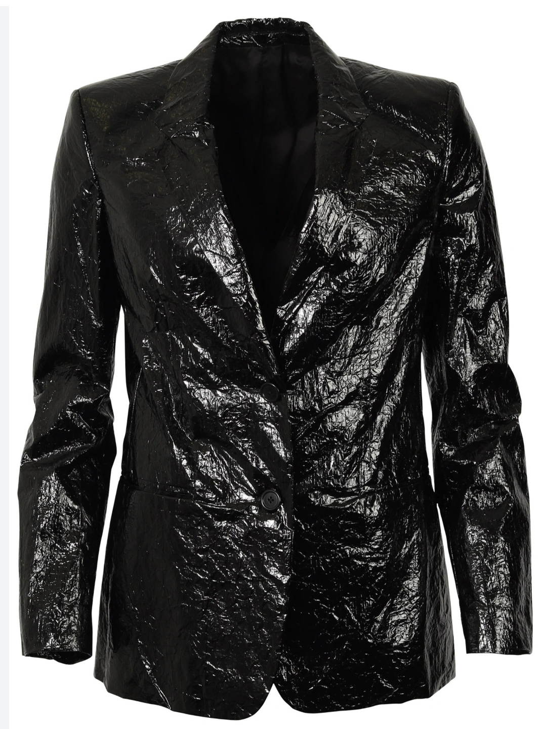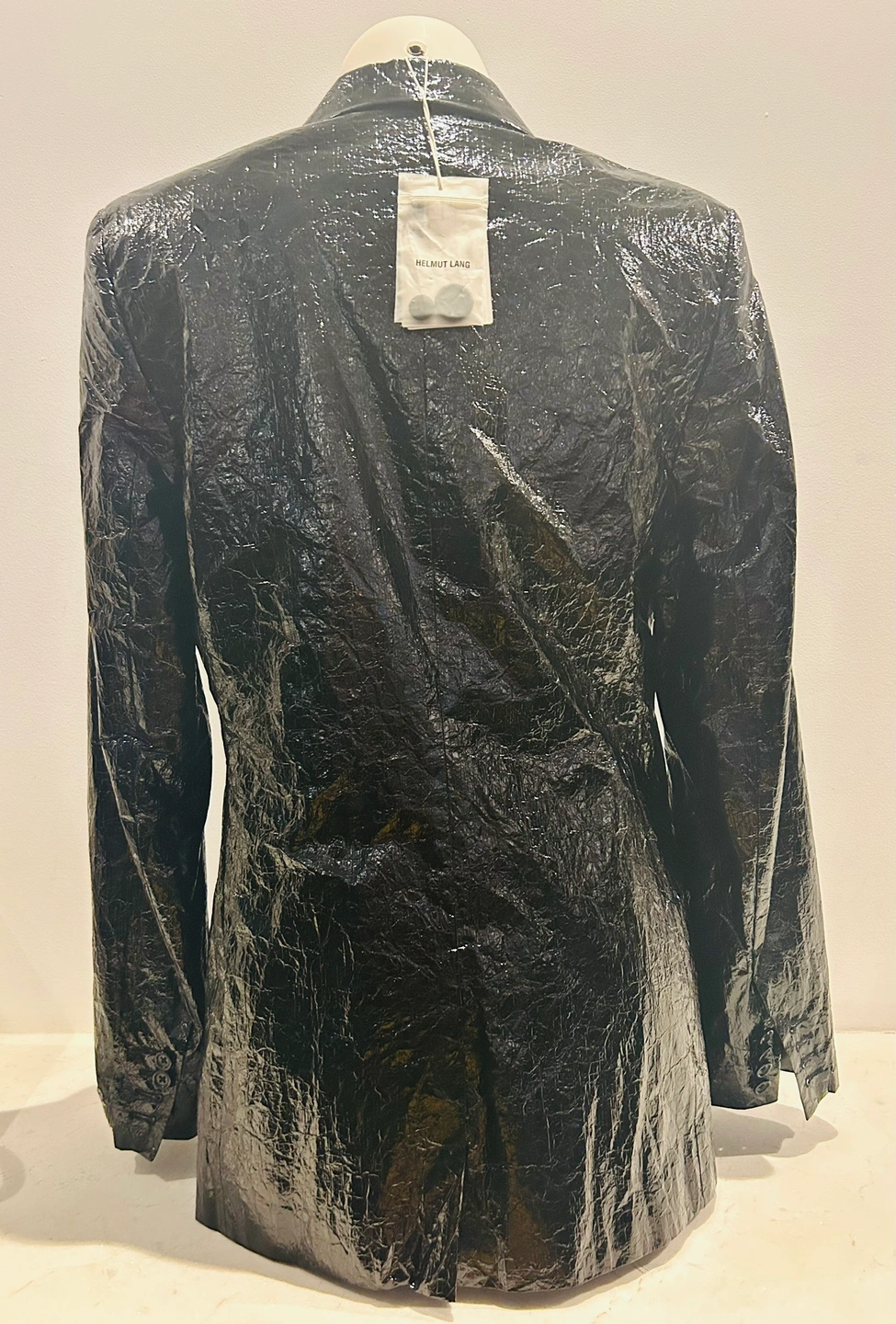 Black shiny blazer. Women’s Helmut Lang wet-look black jacket/blazer. Crinkled Mylar. New with tags. Extra buttons. Viscose lining. Size 8 American. Polyurethane. Retailed for over $900. So sleek and cool. #helmutlang