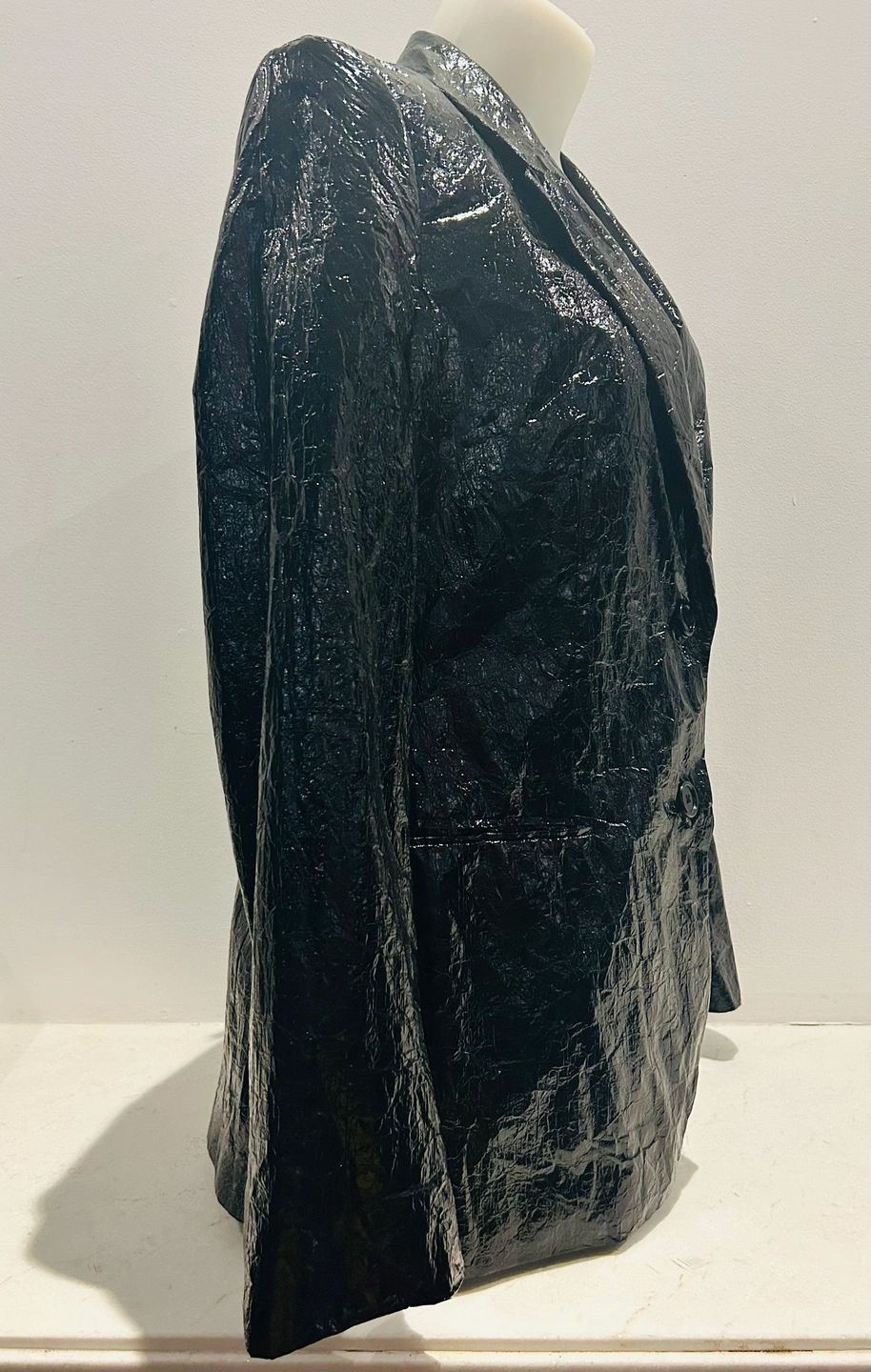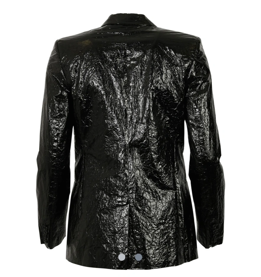 A black blazer in a shiny, textured finish.