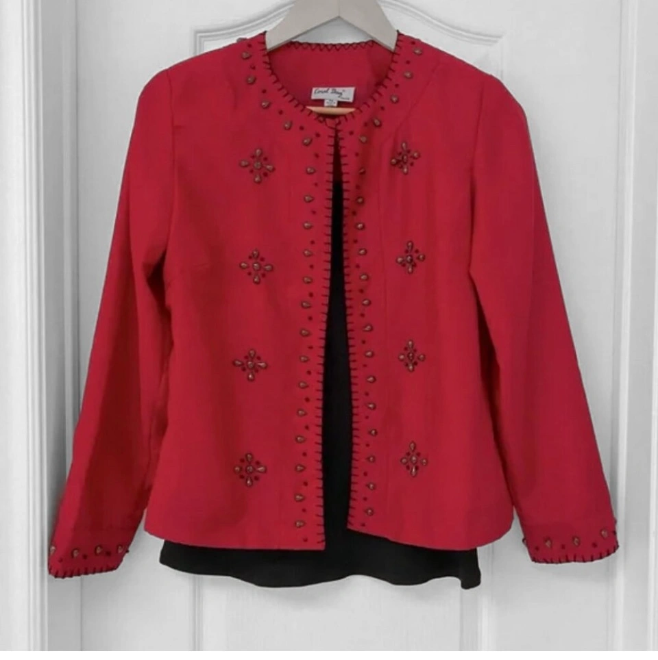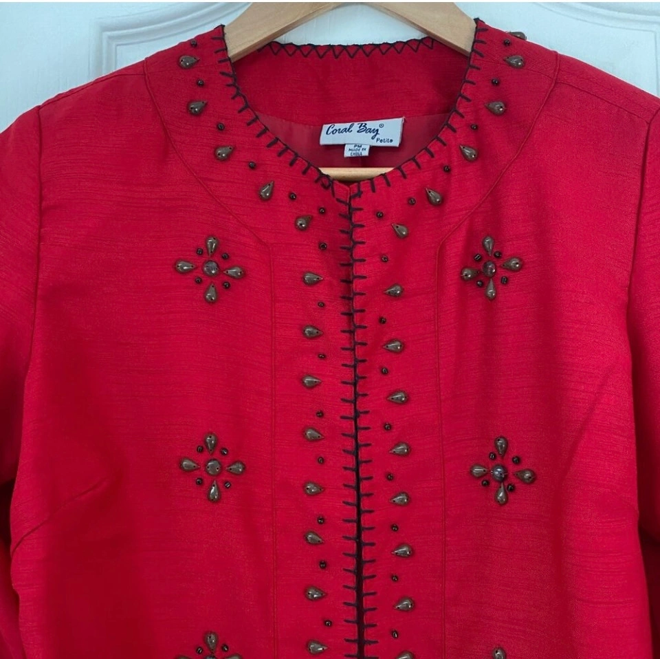 Coral Bay - Red Embroidered Silk Look Embellished Jacket Size: US MP Like new condition! Great little all-season jacket. Dress it up or down, looks good either way! Measurement: 19 1/2" ptp Fabric: polyester, looks like silk • Has small build in shoulder pads • Pretty embellishment's • Comes from a Pet-Free, Scent-Free, Smoke-Free home. Pick up Pickering - Altona & Sheppard