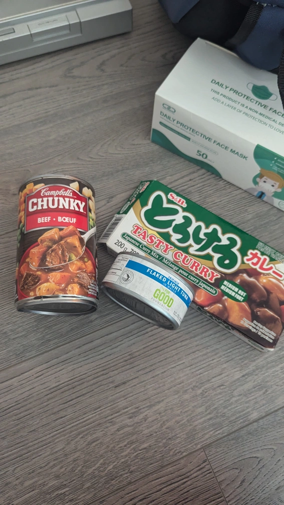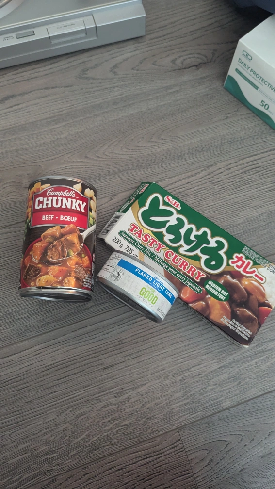 One can of Campbell's Chunky Beef Soup, one can of Flaked Light Tuna, and one box of S&B Tasty Curry Japanese Curry Mix.