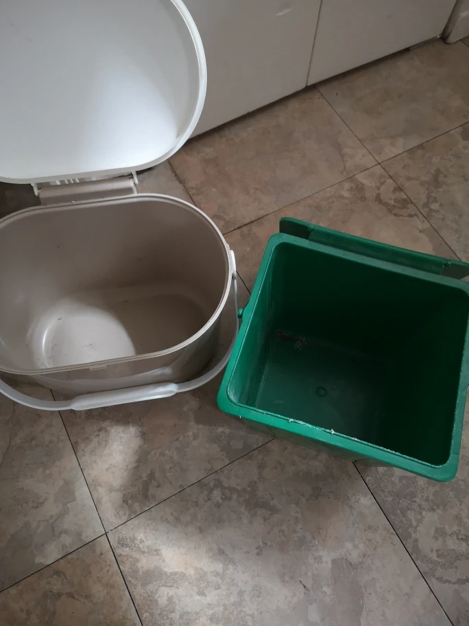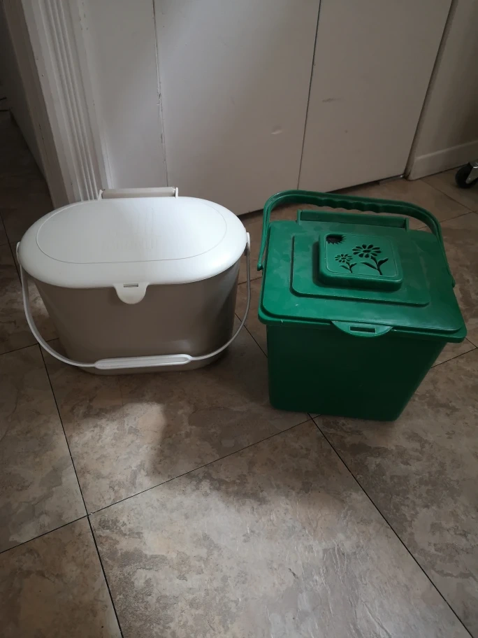 Two compost bins, one beige, one green. Both have lids and handles. Used for dry potting soil, not wet compost.