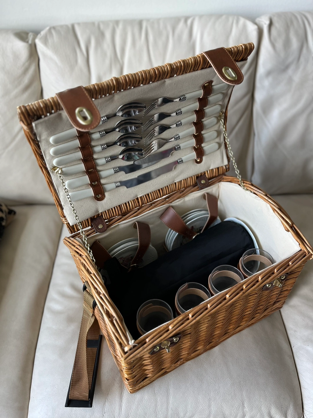 Wicker picnic basket for four people, includes plates, cutlery, and glasses and waterproof picnic blanket. Leather straps hold everything in place, and it has a shoulder strap for easy carrying.