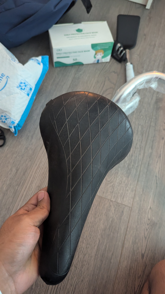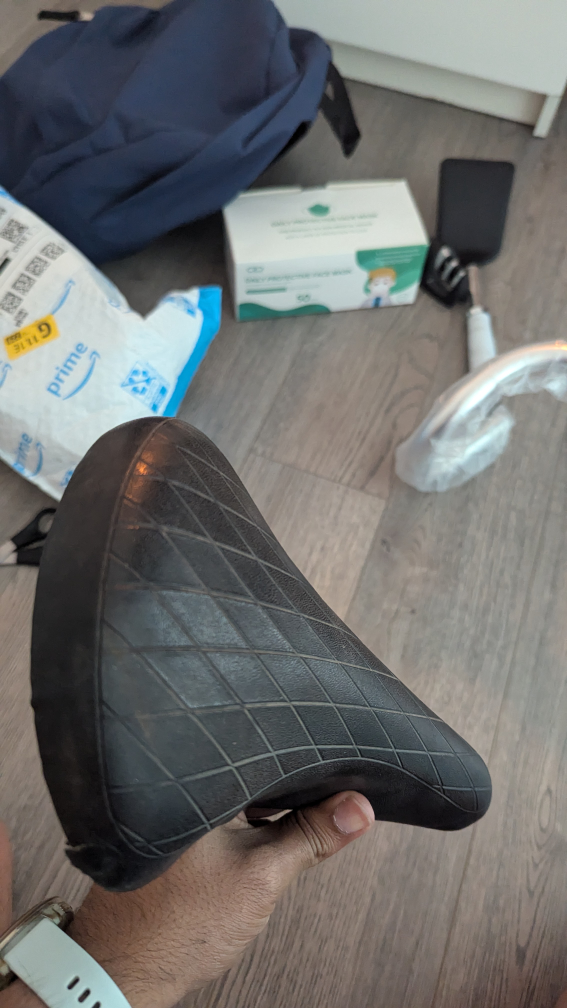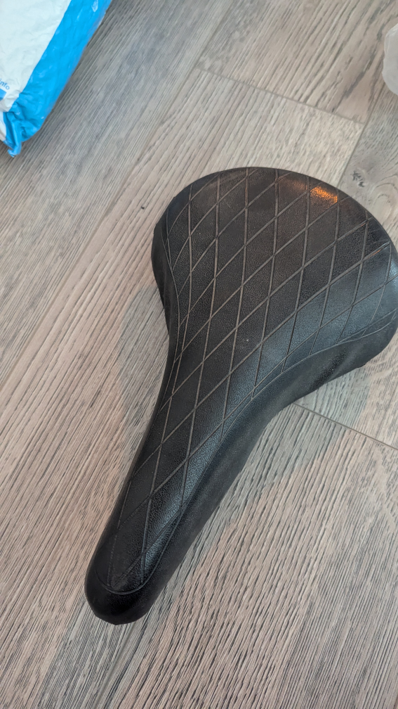 Black bike seat. The seat is in good condition. The underside has some rust but is otherwise clean.