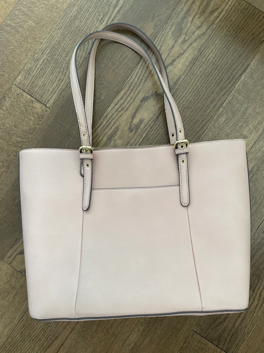 This is a pink tote bag with a front pocket that has a pattern and a zippered closure. It also has two straps with buckles. It is the perfect size for a work bag or everyday use.