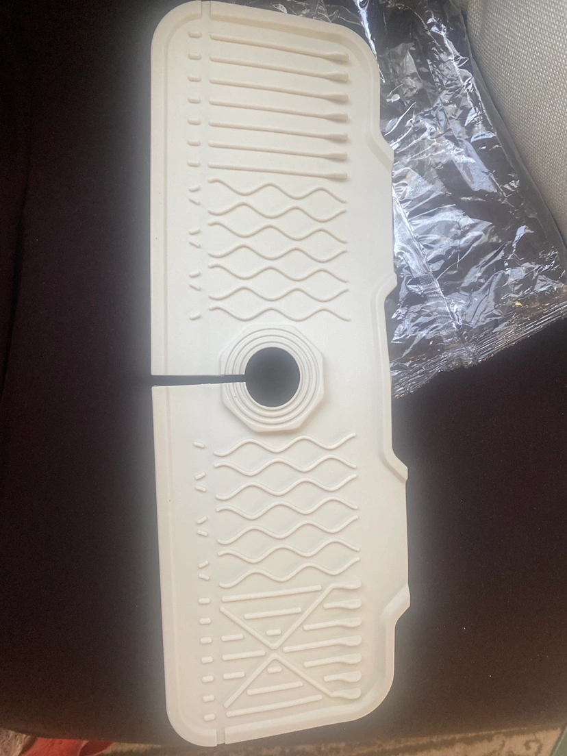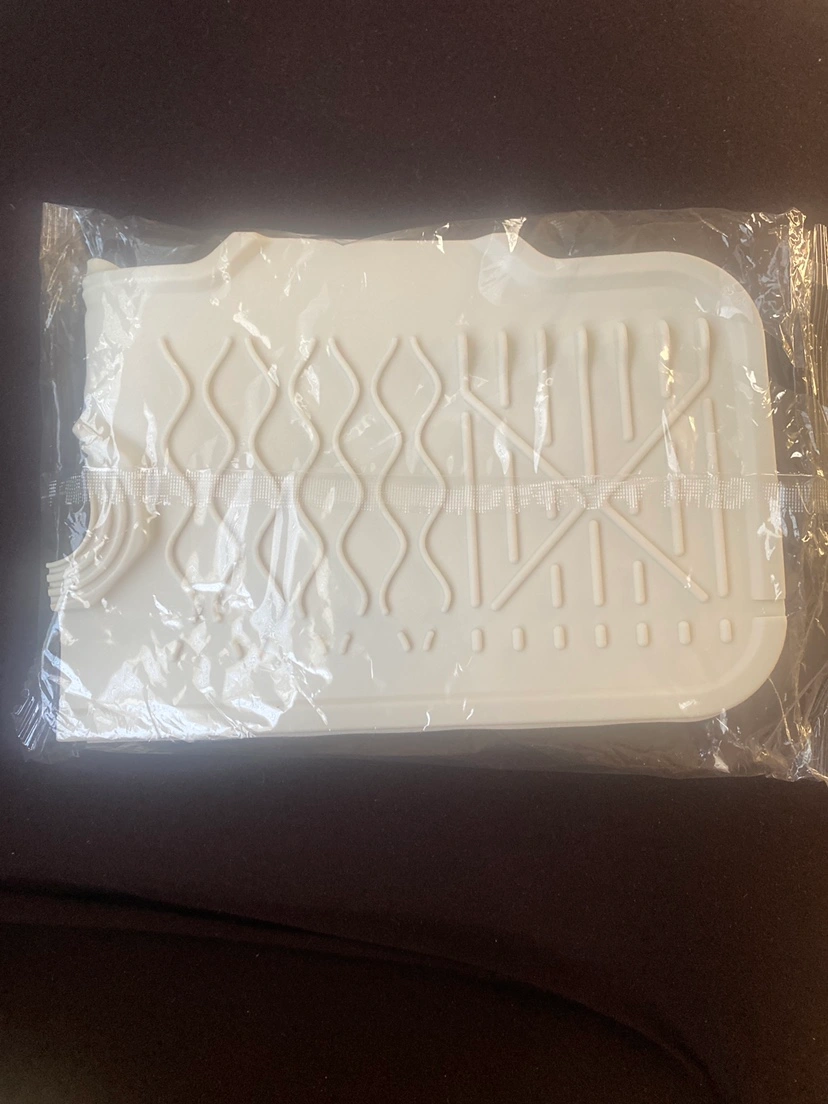 This is a silicone dish drying mat. It has a raised design to help dry dishes. It has a hole in the middle to drain water. It is white.