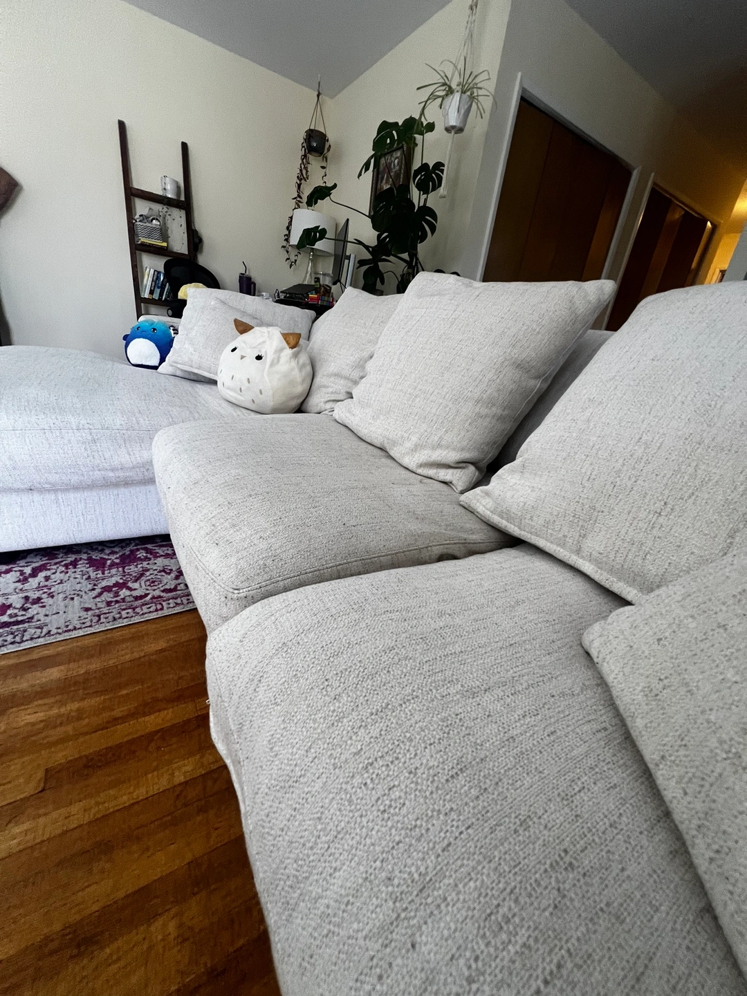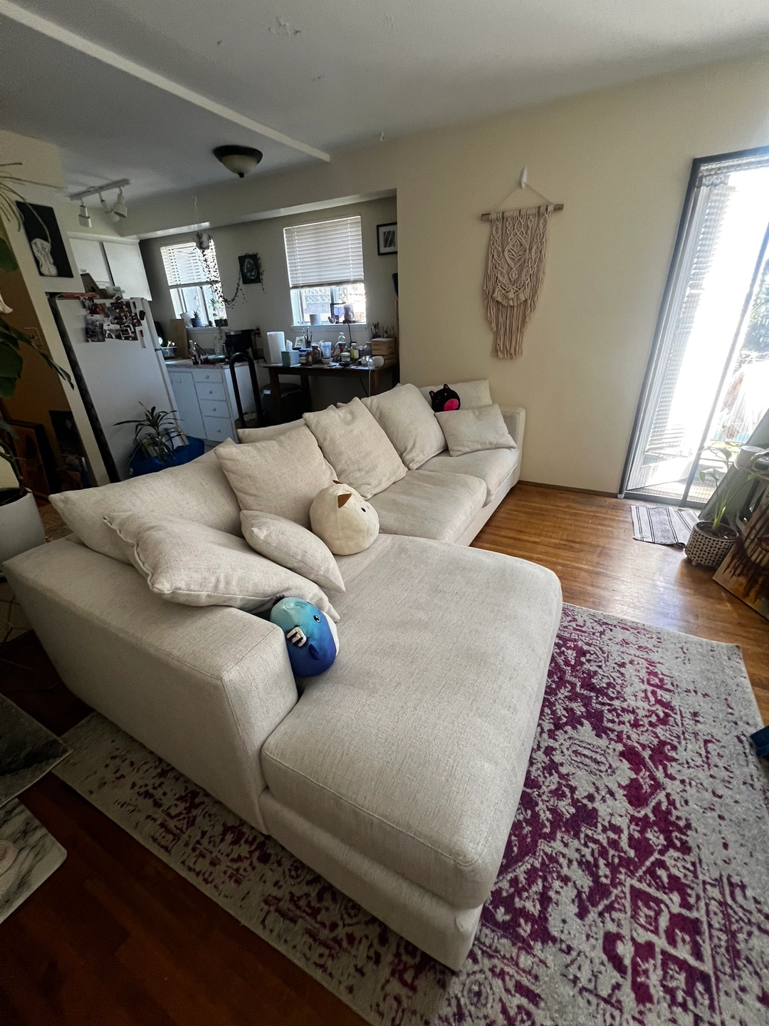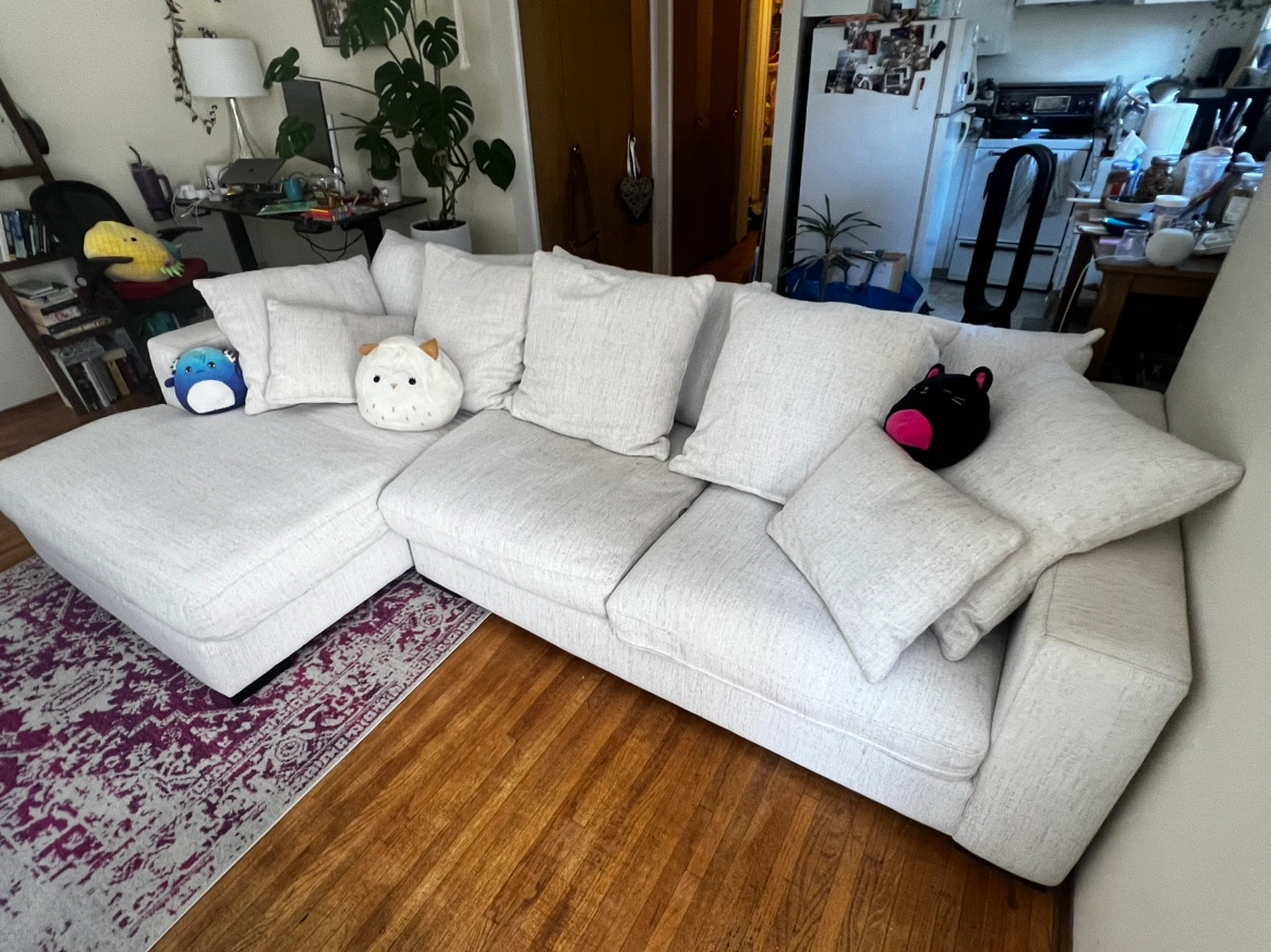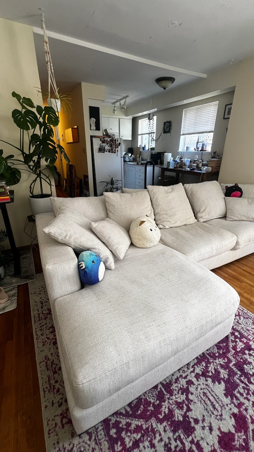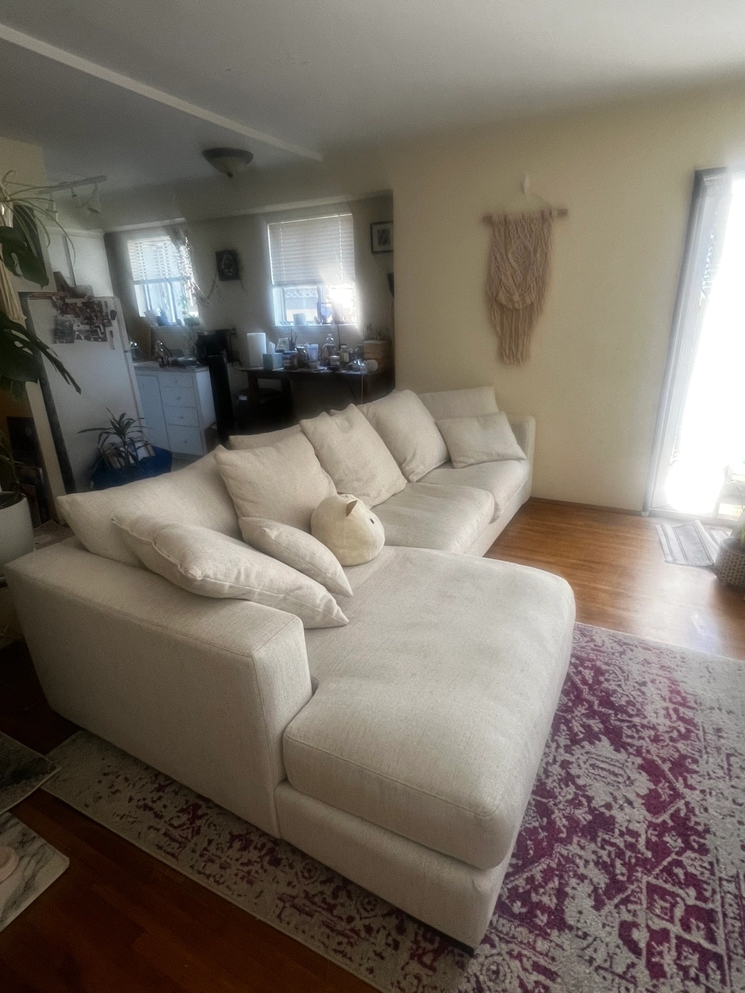 This sectional sofa is in great condition, with a neutral colour that would match any decor. It includes a chaise lounge and is great for large families or anyone who loves to entertain.