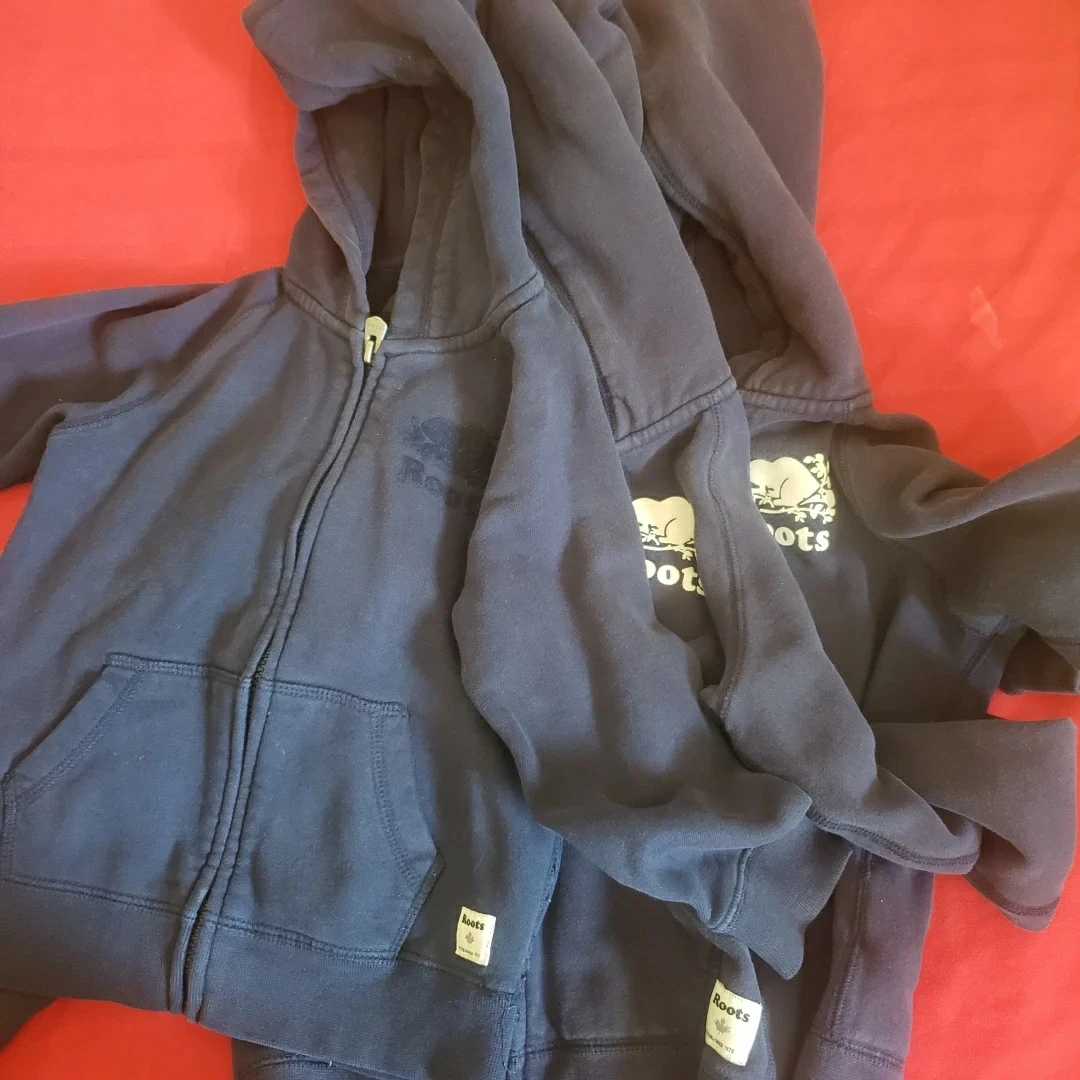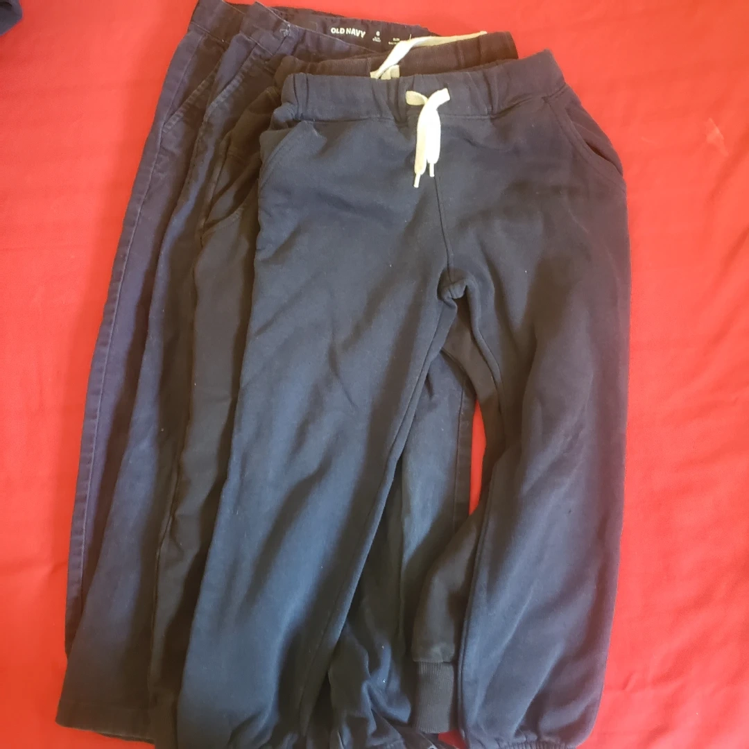 A white long-sleeved immaculate conception school shirt (xs). 3 navy blue old navy shirts (xs). 3 old navy long pants and 1 black (not old navy brand) and 3 roots sweater 2 (s/p 5-6yrs) and 1(5t ). •Two of four of the pants are skinny fit and may fit a 3/4 year old, they are size 6. the black pants is size is 5t-6t. the other is 5t.