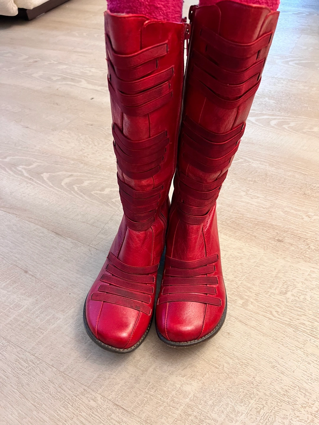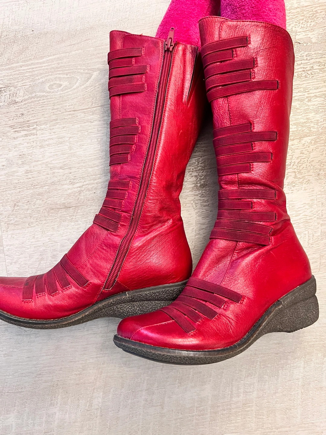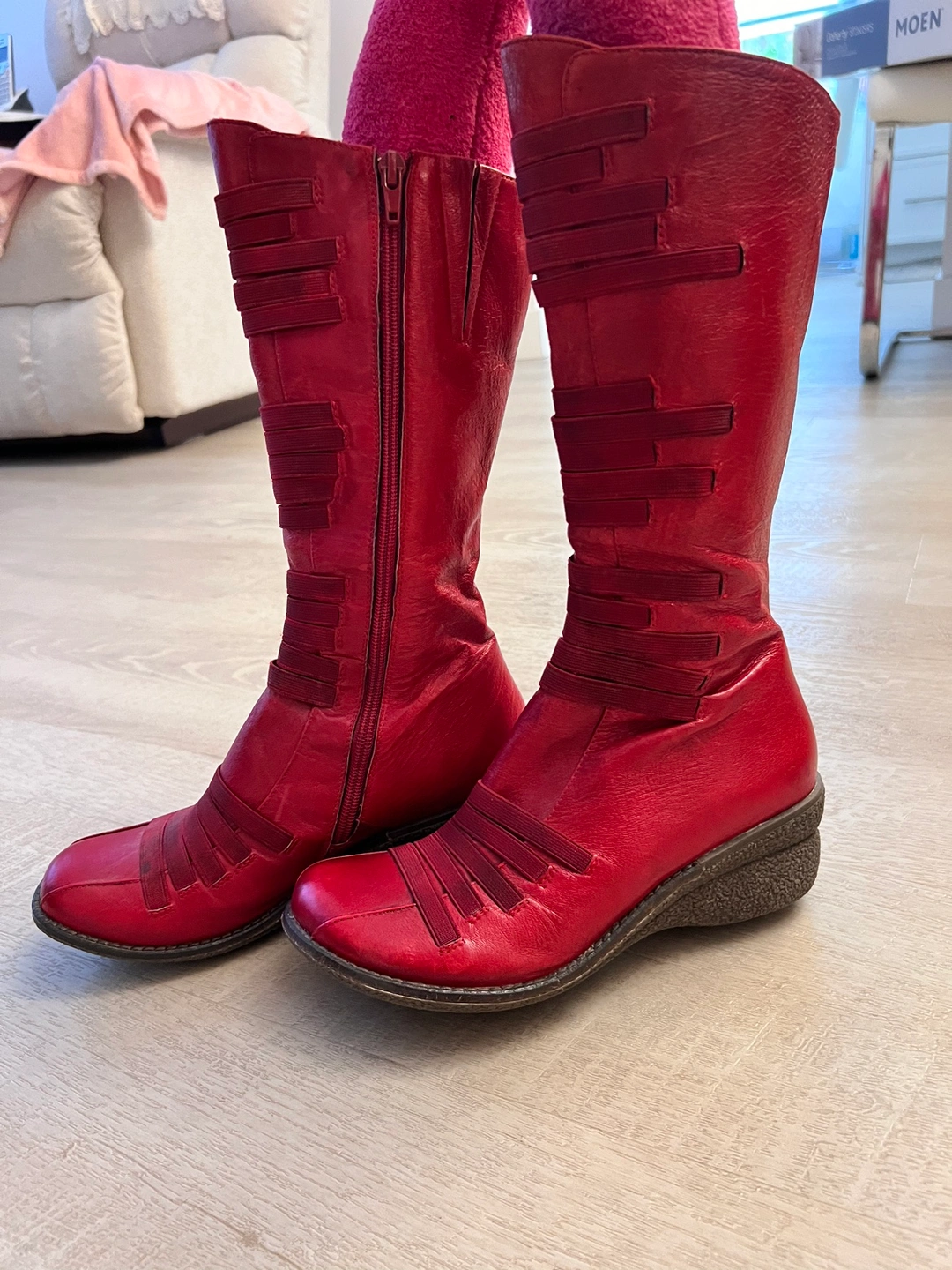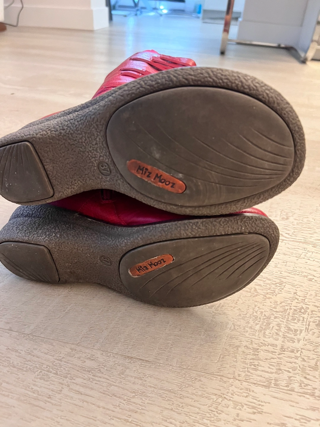 Women's red leather boots with a side zipper, wedge heel, and decorative straps. Fabulous red Miz Mooz mid-calf boots that are size 37 (which is size 6.5 in Canada). They are 13” high and are SO comfortable. Have only wore these boots maybe 10x and they are like new as you can see from the soles. Over $200 when I bought them - only asking $65 or best offer.