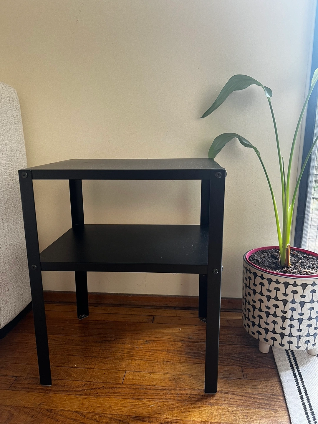Small black end table with two shelves. Perfect for a small space. It is in good condition.