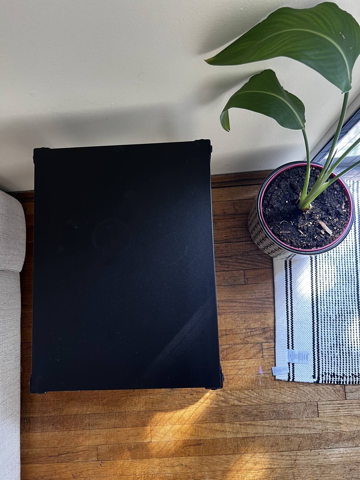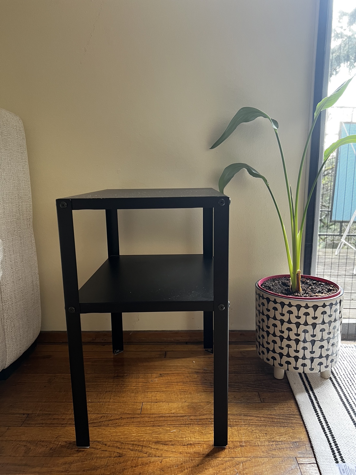 Small black end table with two shelves. Perfect for a small space. It is in good condition.