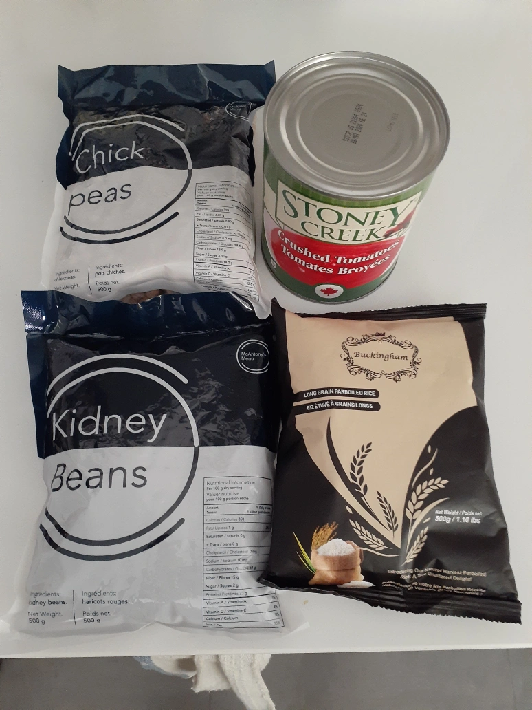 A bundle of canned goods and dry goods, including chick peas, kidney beans, crushed tomatoes, and rice. No Expiry date on beans Pls refer to pic 2 for Expiry dates Cash and Pickup close to Willowdale middle school OR NorthYork Centre Station. PLEASE check distance before responding. Thanks!