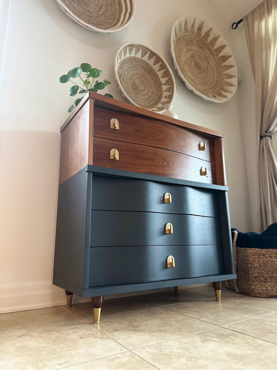 This dresser was professionally refinished using high quality furniture paint (Fusion Mineral Paint in Ash) the top was completely stripped to raw wood, paint washed and sealed with polyurethane.