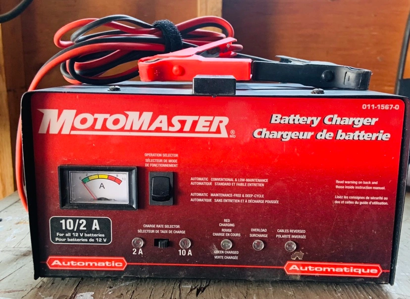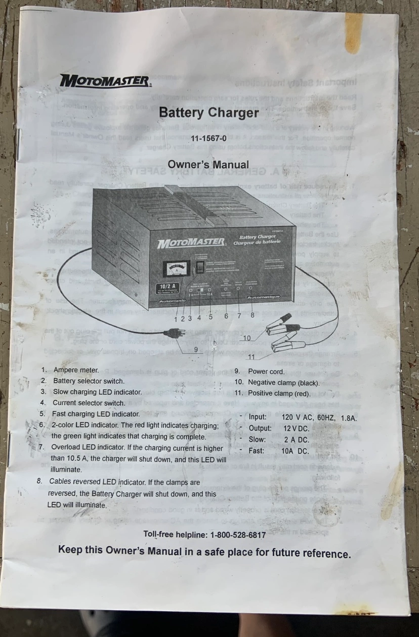 This is a Motomaster 10/2A Battery Charger. It is in its original box with the owner's manual. It features a charging rate selector and an ammeter. It is automatic and has red and green LED lights to indicate charging status.