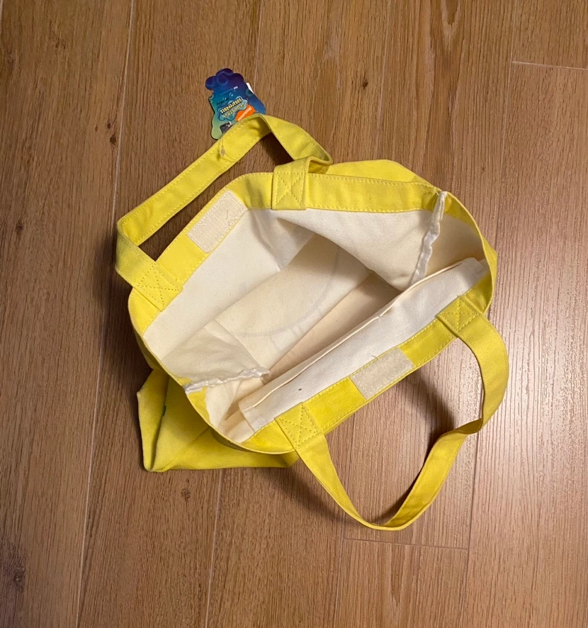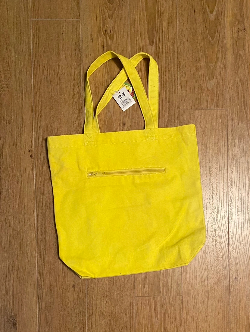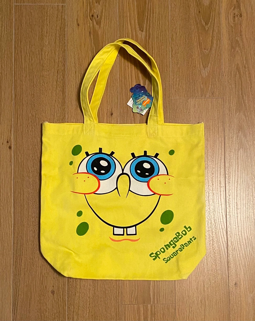 A brand new yellow cotton tote bag with SpongeBob SquarePants face design on the front. It also has a zippered pocket on the back and a large main compartment. The bag has a self adhesive tag at the top opening as well.