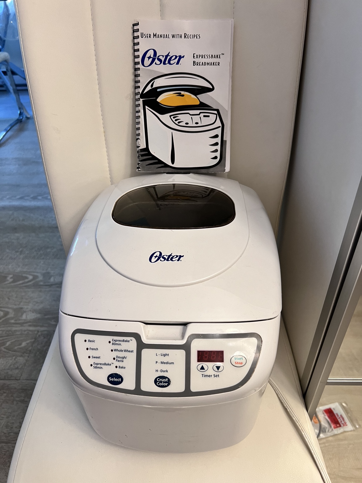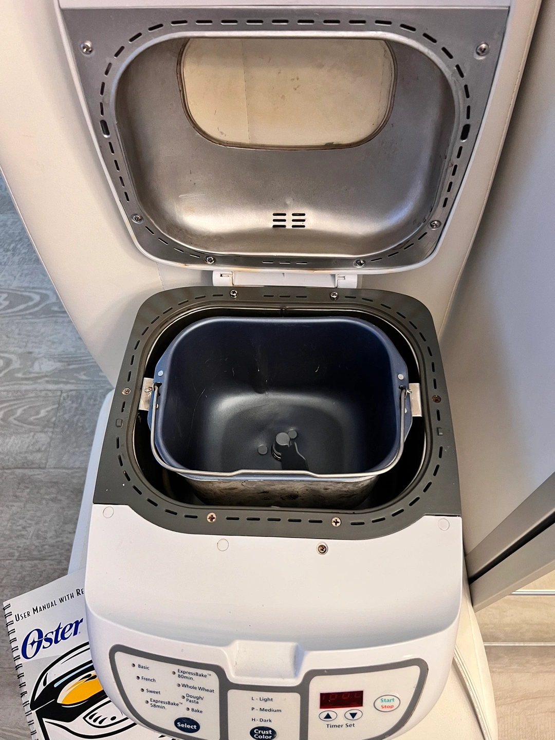 Oster ExpressBake Breadmaker with instruction manual. This bread maker is in good working condition. Features include multiple crust colours, different loaf sizes, and a timer.