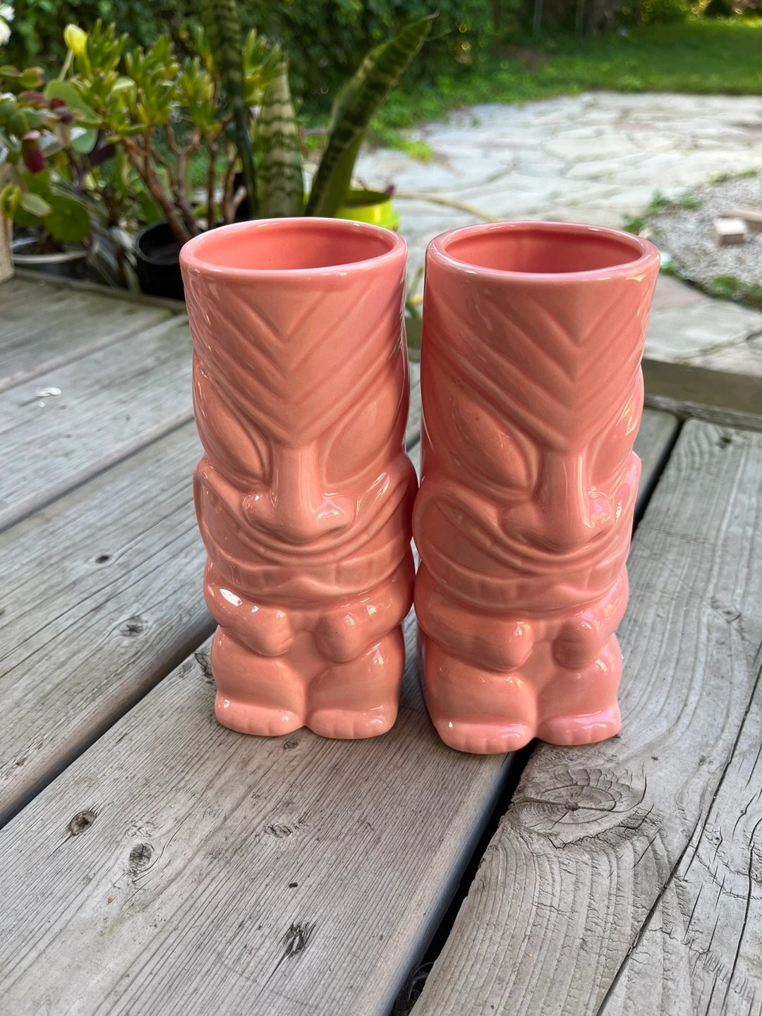 Set of 2 pink tiki mugs. These mugs are great for serving drinks, adding a touch of tropical decor to your home, or just for a fun conversation piece! Brand new with no defects.