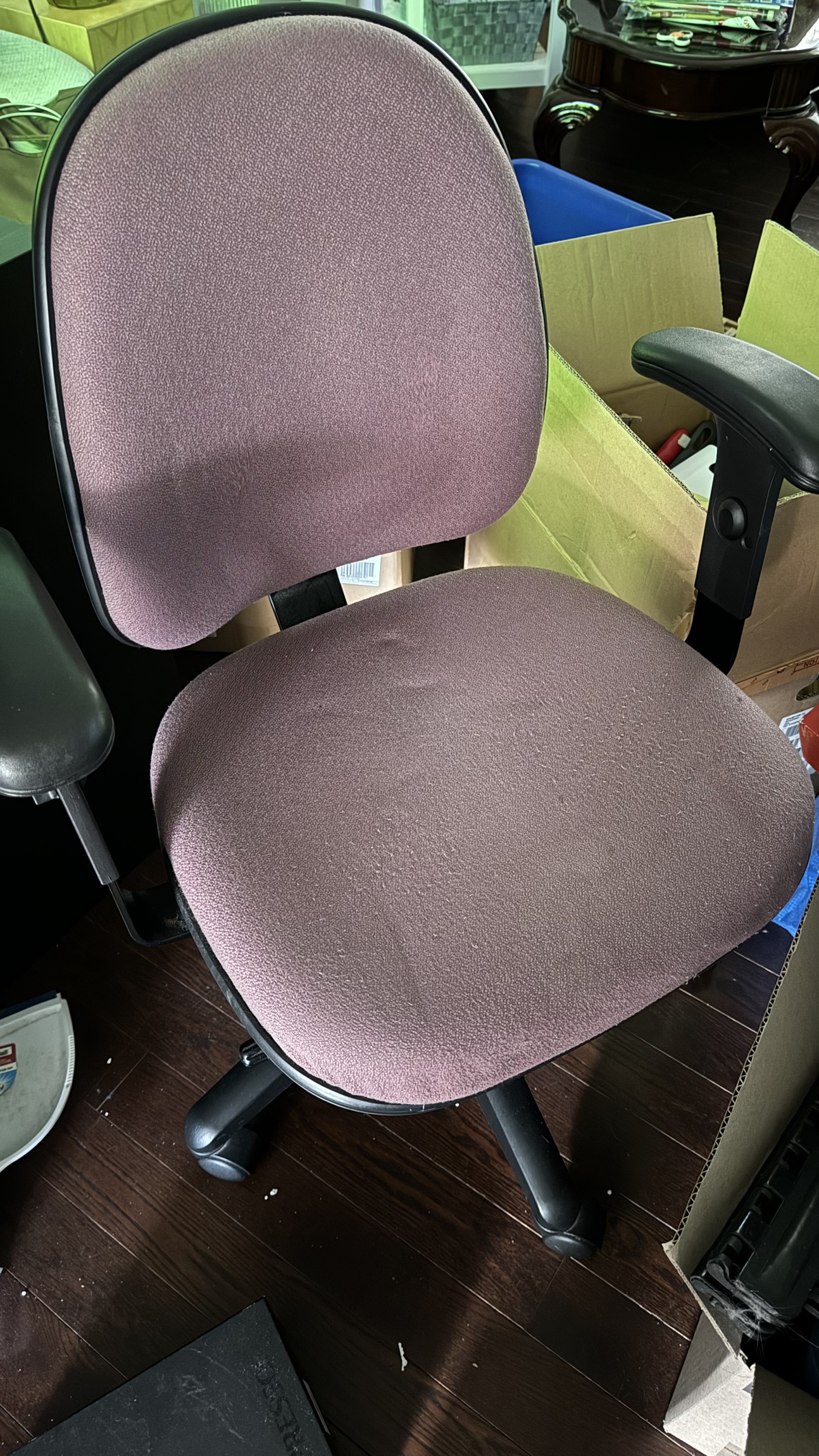 Purple fabric office chair with black frame and arms. Has adjustable height. Great for home office or work. Pick up only.