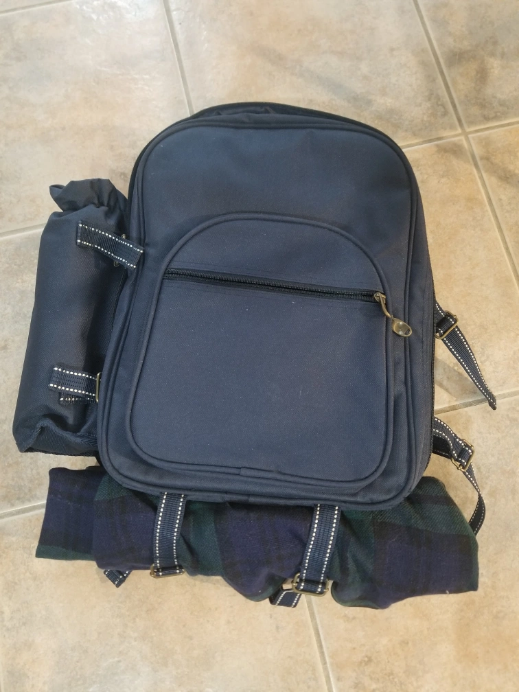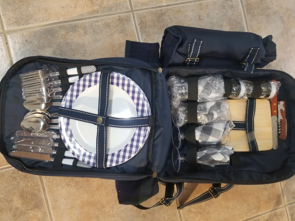 143A navy blue picnic backpack with everything you need for a picnic for four. Includes plates(3), cutlery, wine glasses, a bottle opener, a cutting board and a blanket.