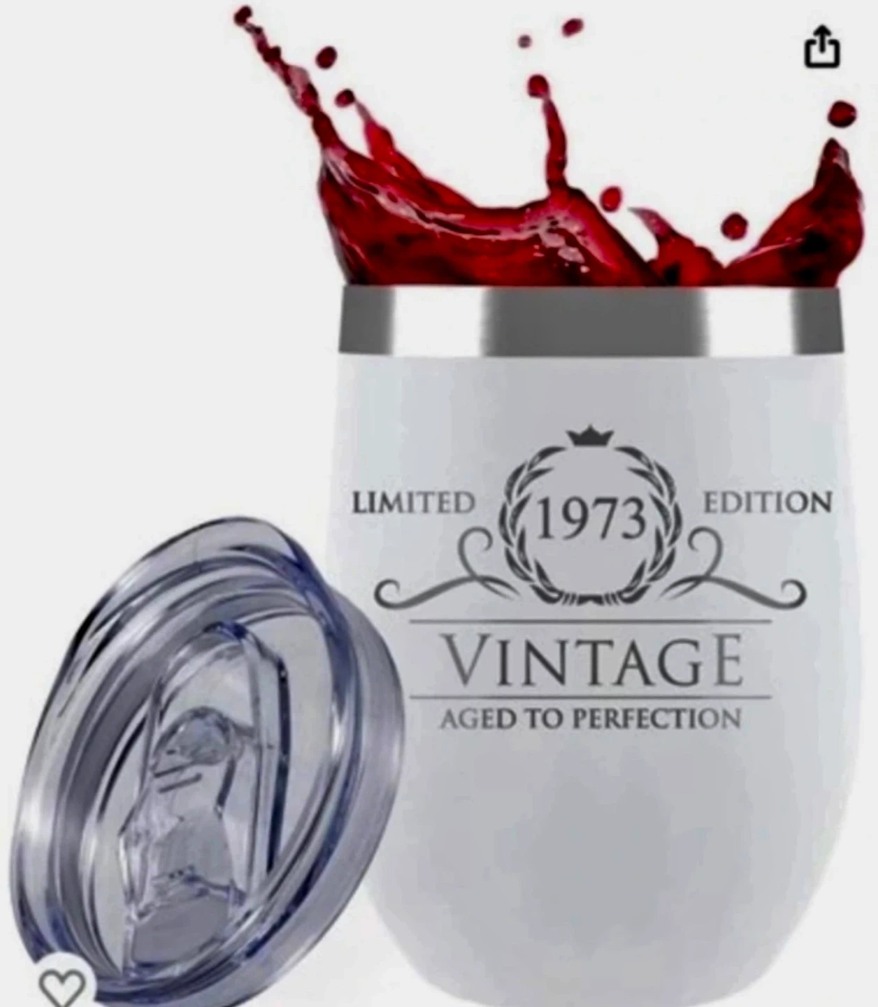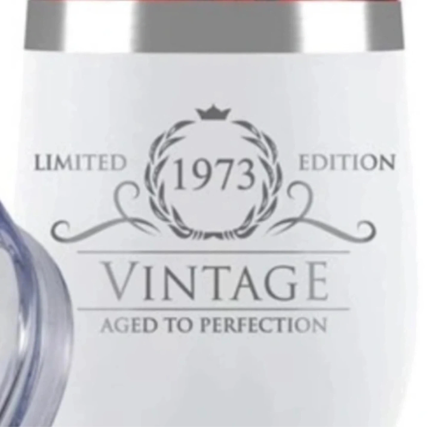 White wine tumbler with a lid and a "Limited Edition 1973 Vintage Aged to Perfection" design