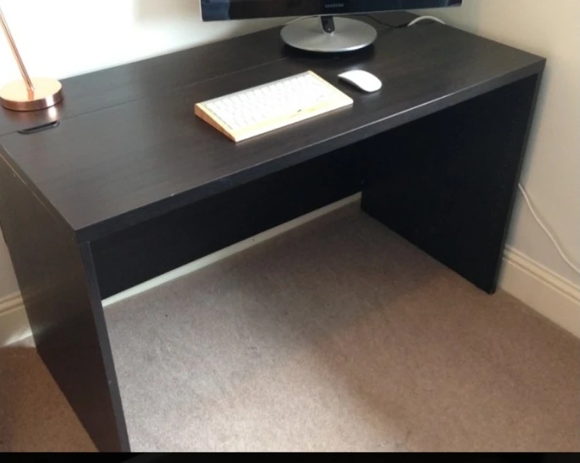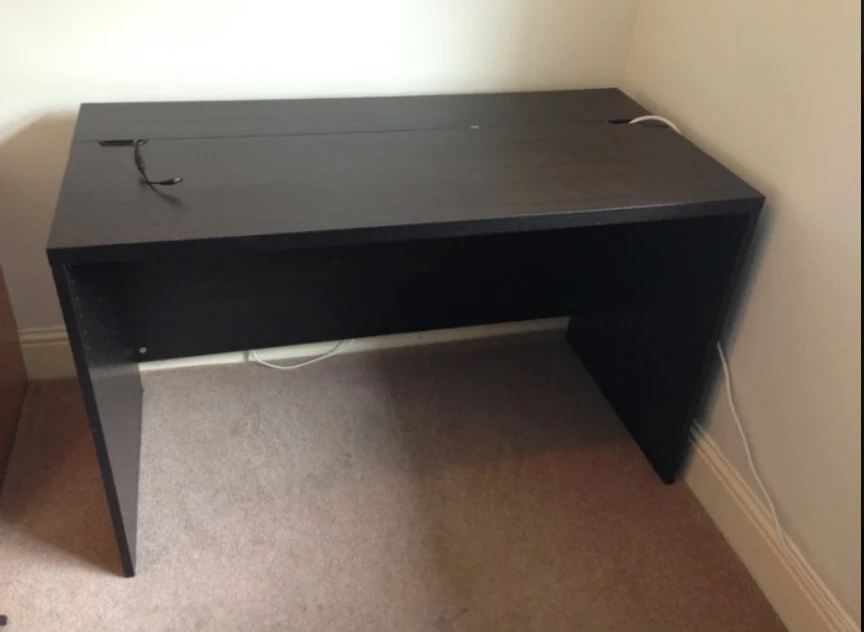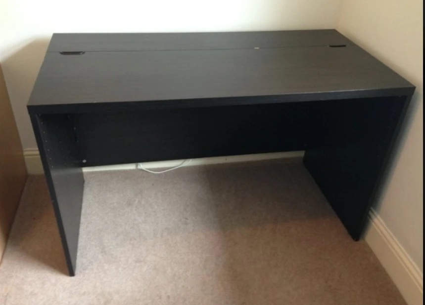 226Bown black desk. there is a cable management area at the back. you can add extra storage shelving inside the desk very sturdy condition: 8/10 Dims: 48' x 23' selling assembled Pick up only