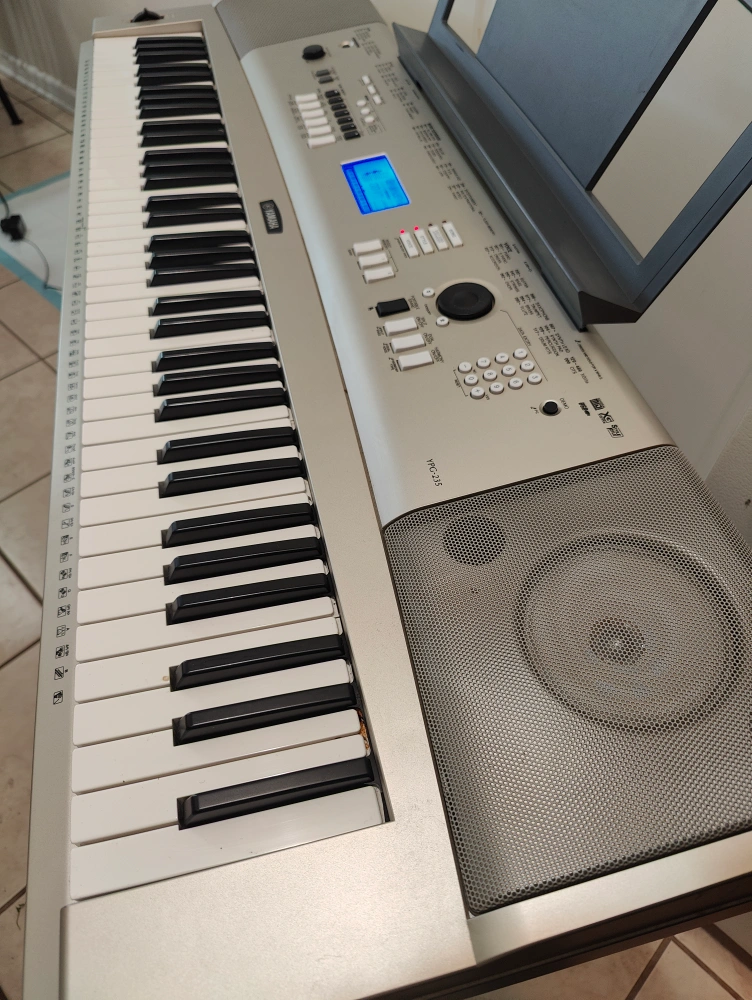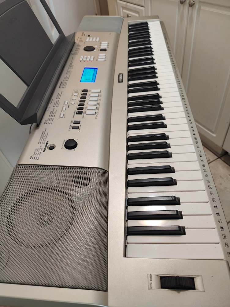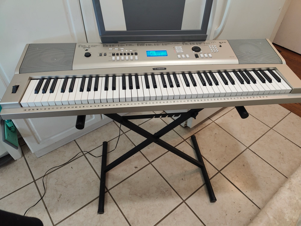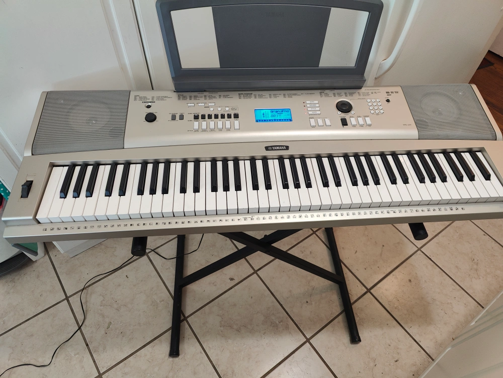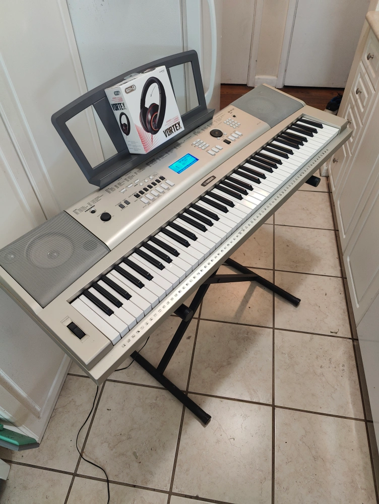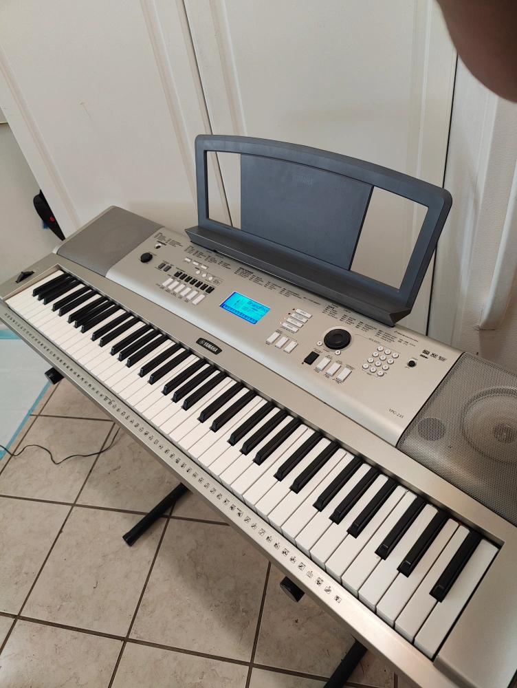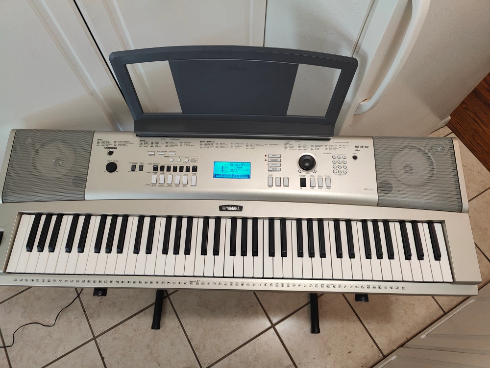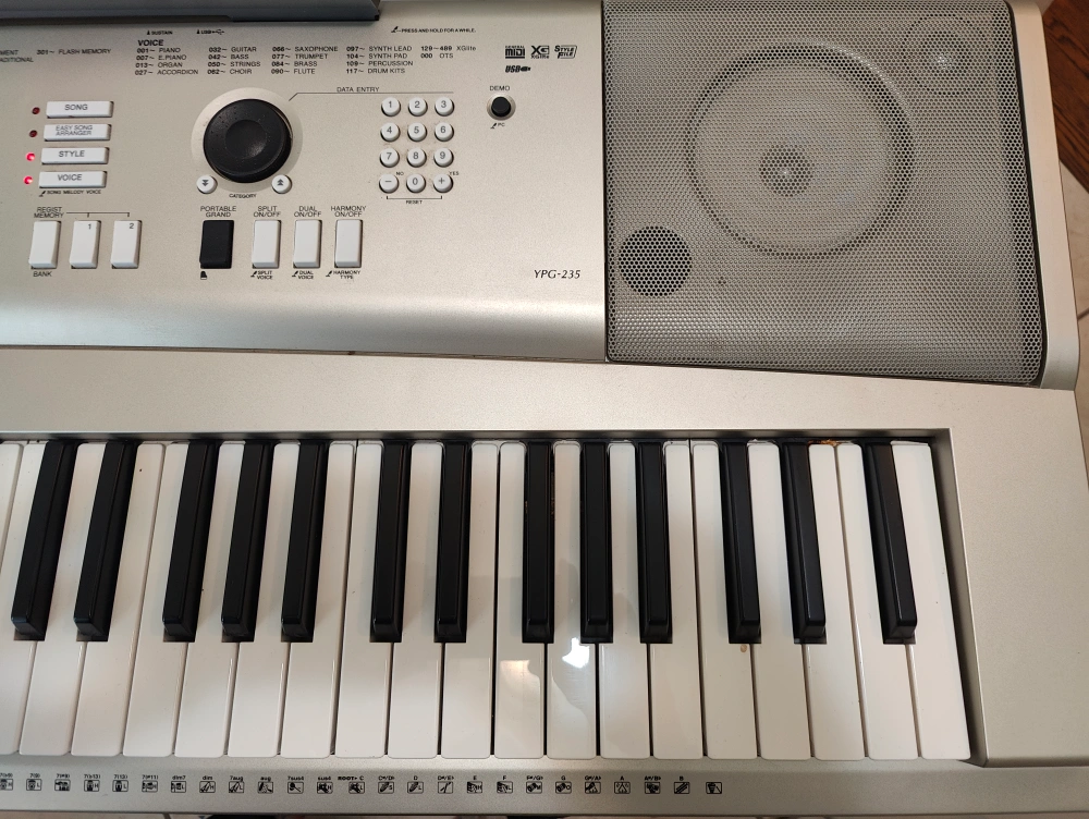 160Yamaha YPG-235, 76 keys piano keyboard like new condition. It comes with stand, music rest, power adapter and headphones. The Yamaha YPG-235 is a portable 76-note keyboard with full-sized touch-response keys, that operates on D-cell battery power or from an AC adapter. The unit provides a built-in 12-watt stereo amplifier and a pair of 2-way bass-ported stereo speakers for playback monitoring.p The YPG-235 is equipped with a large, high-quality library of AWM technology sounds, including a realistic stereo-sampled Grand Piano with its own access button. A built-in digital effects processor provides lush sound enhancement, and a master 5-band EQ allows the user to adjust the sounds to taste