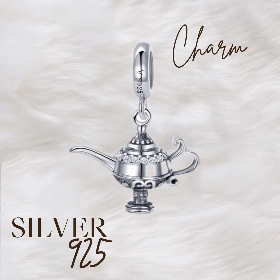 Sterling Silver Genie Lamp Charm with clear stones. Suitable for a charm bracelet or necklace.