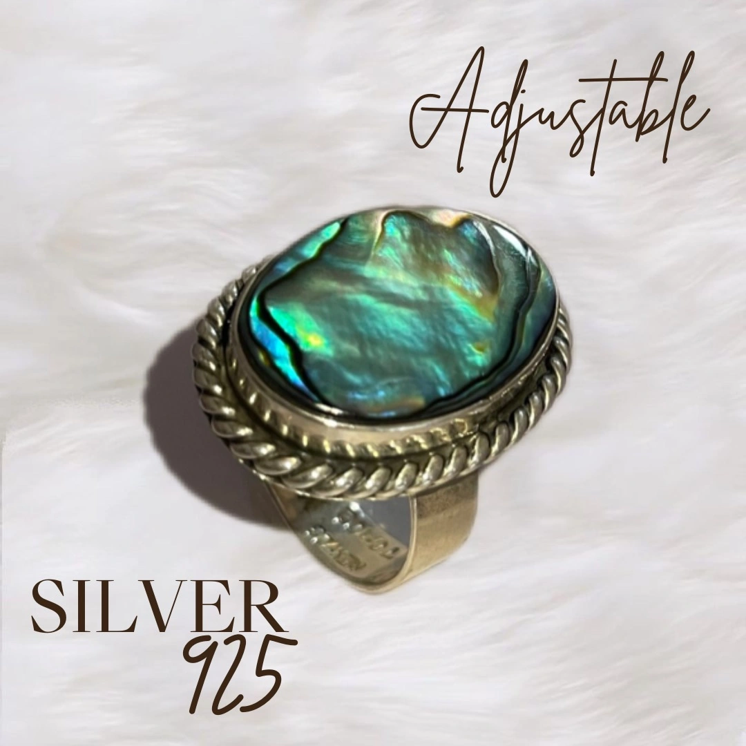 A beautiful ring with a large abalone shell. The ring band is silver and adjustable. There is no size to it. Adjustable