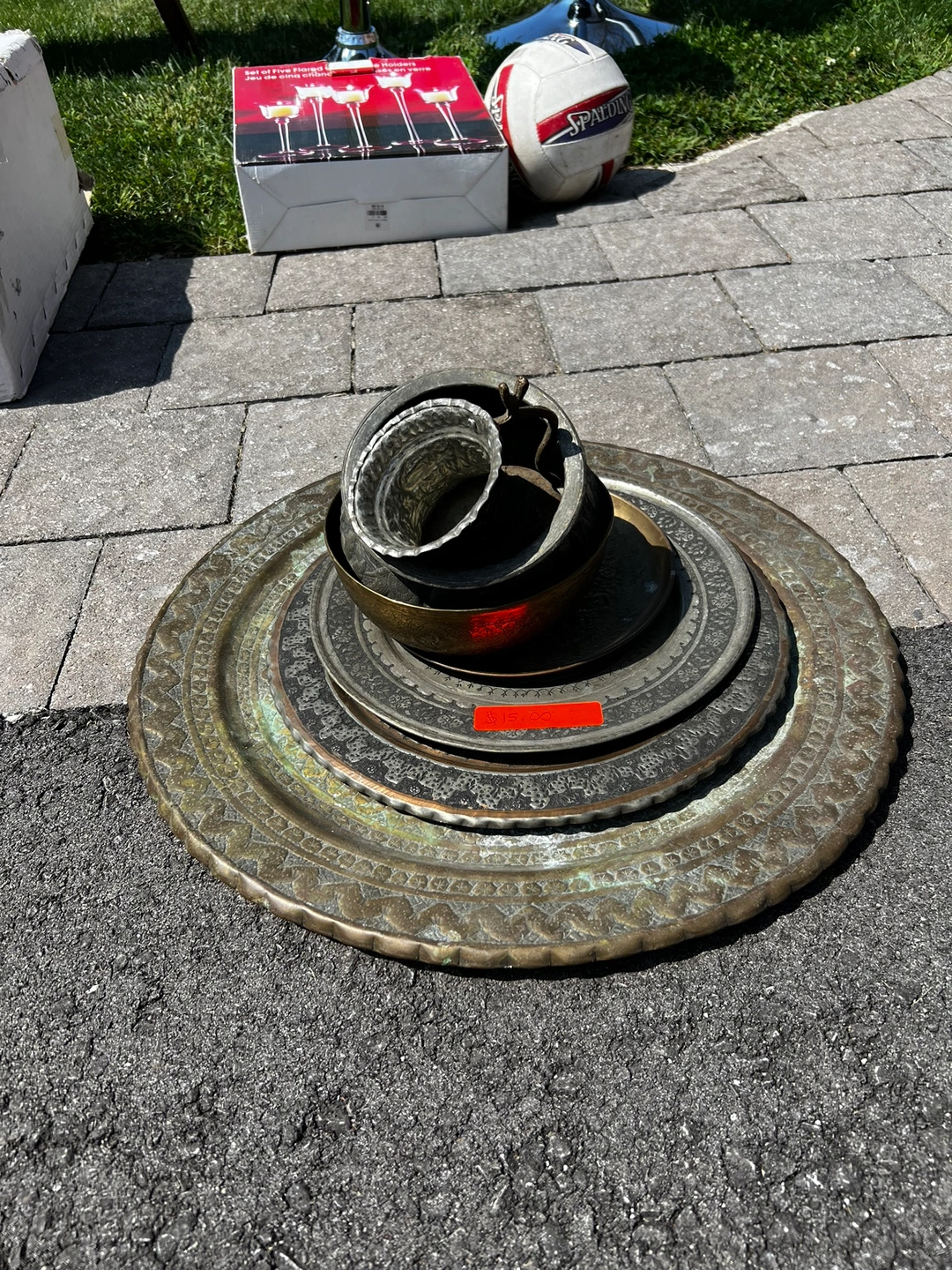 109These Persian brass trays, bowl and cup feature intricate designs and are in excellent condition.