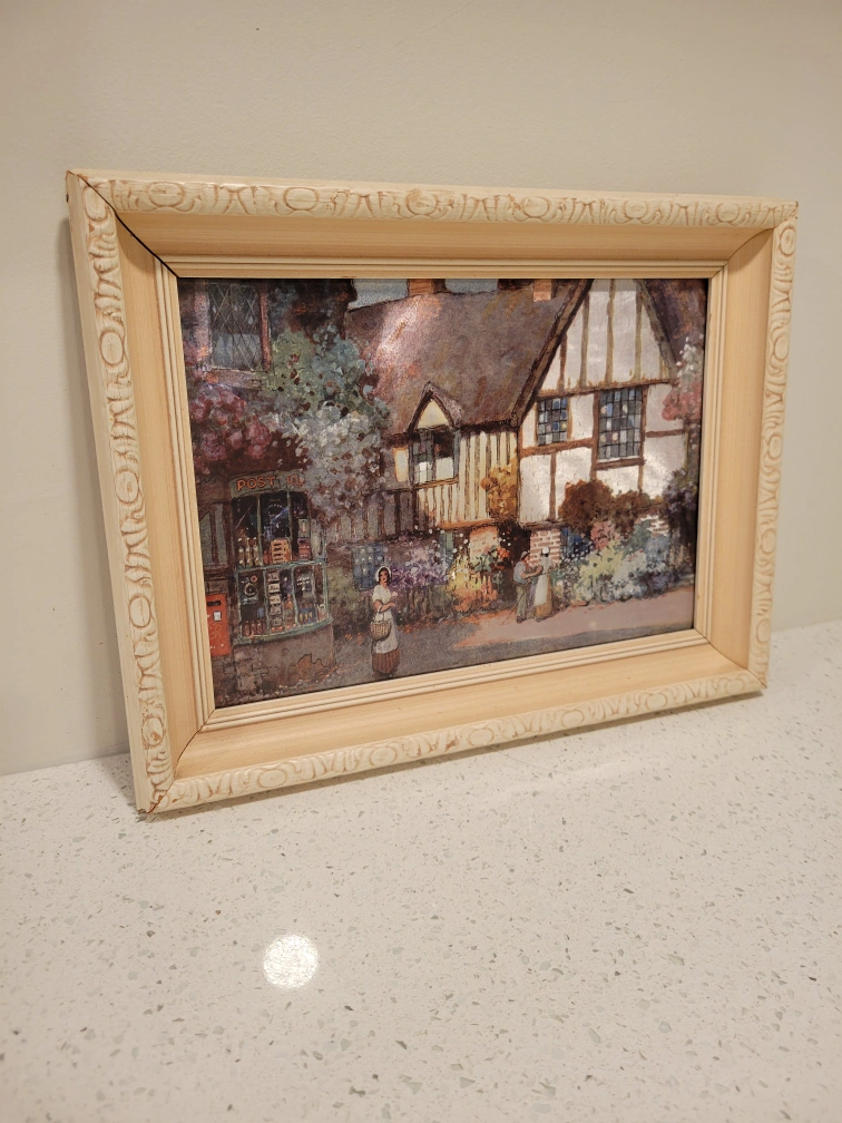 10313.5" x 19.5" Frame Inside 7.5"x 10" Great Condition This is a vintage mid-century foil lithograph art print by Ernest Uden, depicting an old English village scene. The print is framed in a wooden frame and features a thatched-roof cottage, a village shop, and figures in traditional dress. The foil lithograph technique gives the image an iridescent quality $30 Fennell and Upper Gage Hamilton. Please see my many other listings by clicking on my profile.