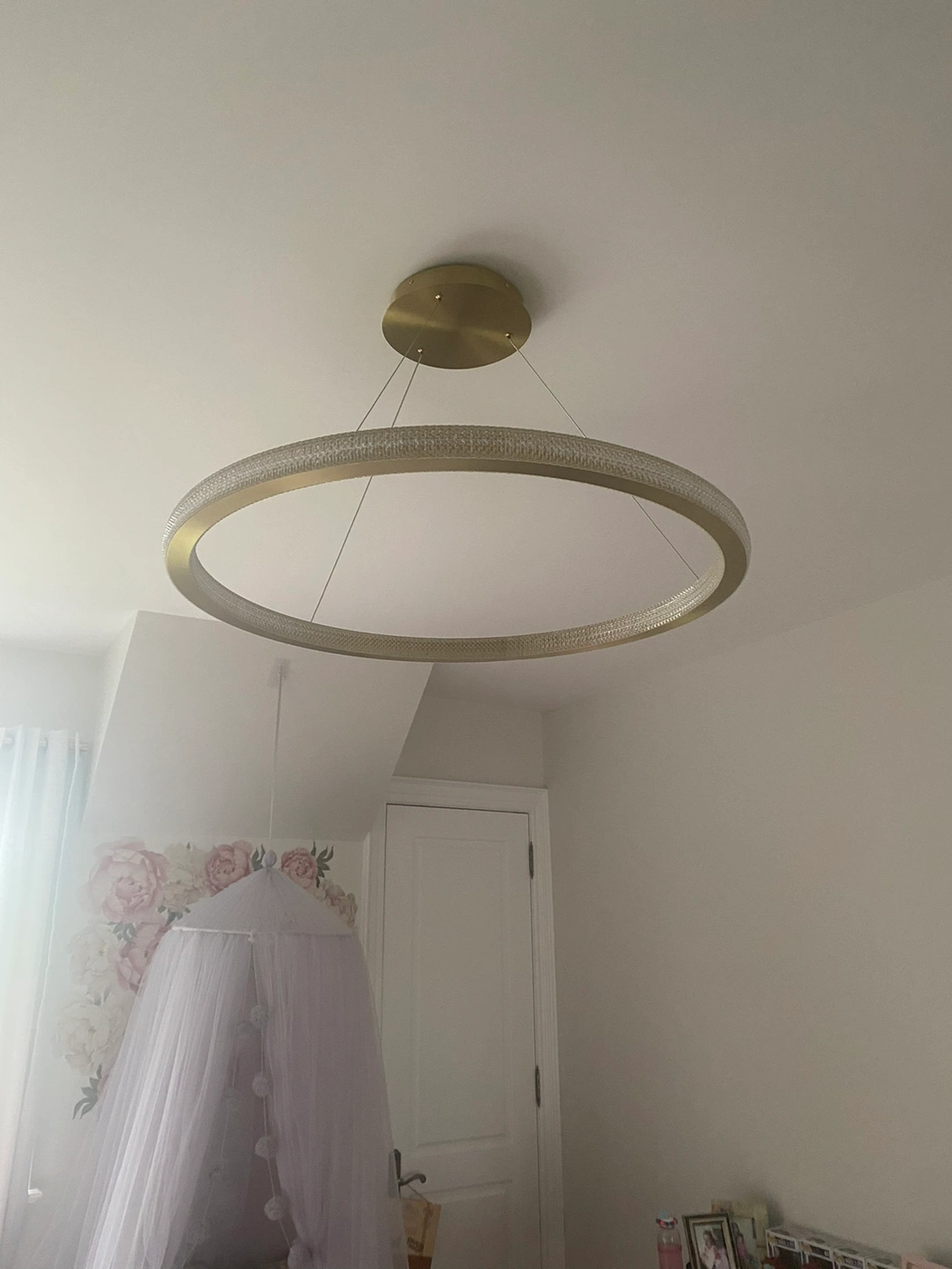 5This is a beautiful 33" gold round chandelier that is sure to add a touch of elegance to your home. modern brass integrated led light fixture. Bought new $675+tax. Great deal!