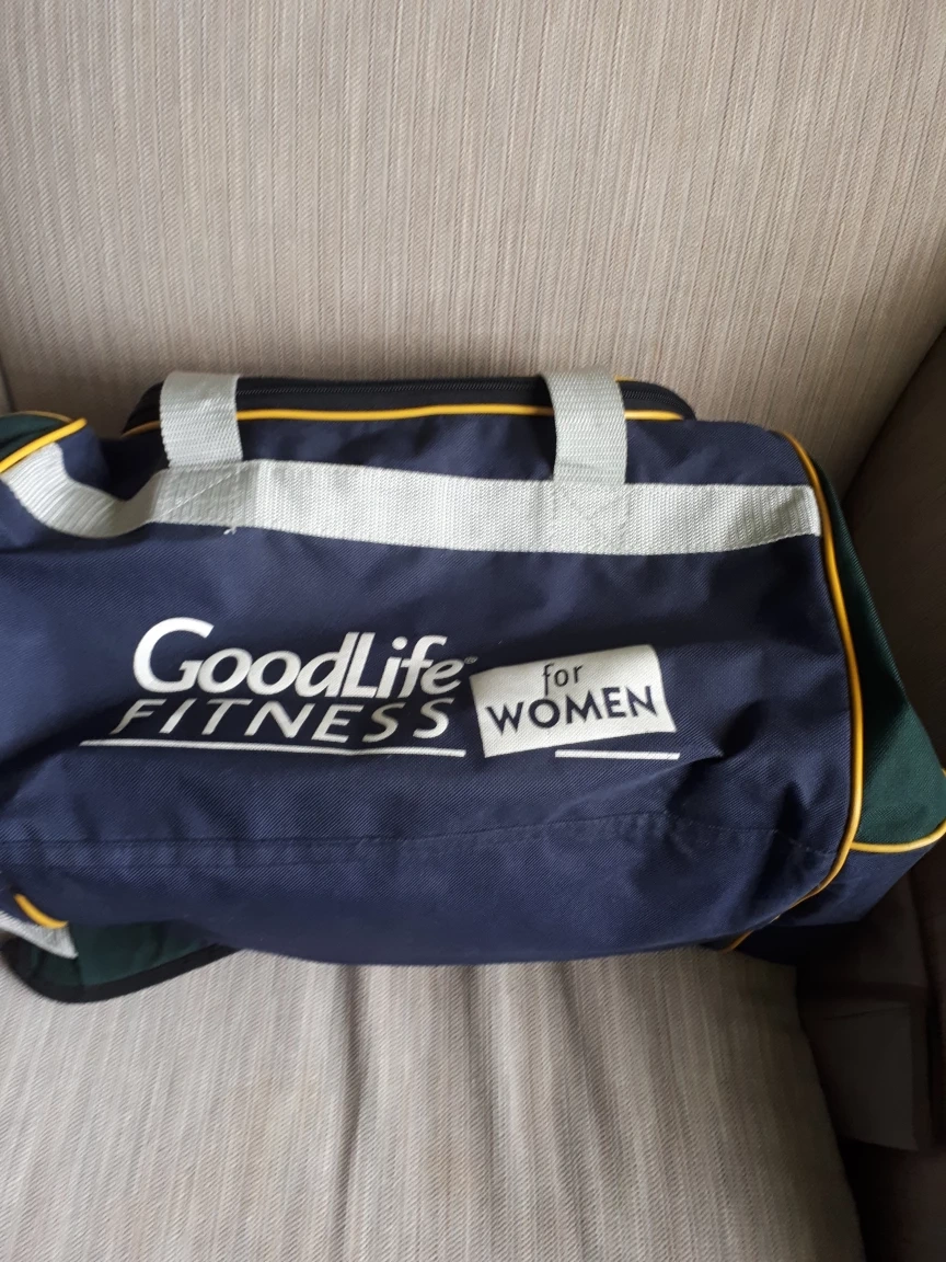 961This is a GoodLife Fitness for Women Duffle Bag. It is navy blue with green trim and yellow piping. It has a white GoodLife Fitness for Women logo. The bag has a zipper closure and two handles.